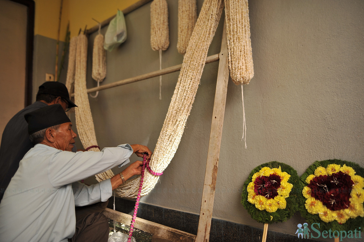आकाश भैरव सजाउने लाभाको माला मिलाउँदै। तस्बिर : नारायण महर्जन
