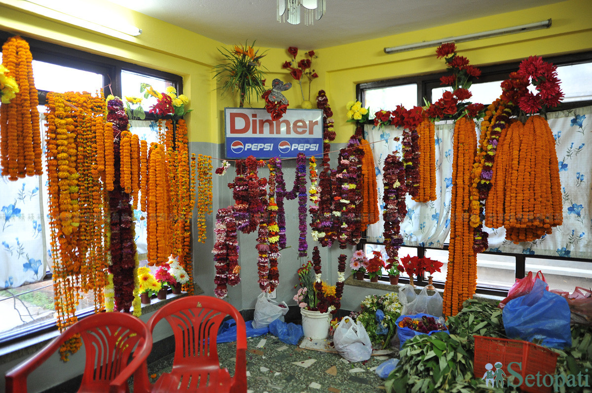 ‘यी फूल त निकै कम हुन्,’ फूल उन्दै गरेकी हिरा महर्जनले भनिन्, ‘पहिले त मानिसहरु खर्पनको दुईपट्टि फूल बोकेर ल्याउँथे। अहिले पो टोकरी, झोला र हातहातमा ल्याउँछन्। कसैले त प्लास्टिकका फूल पनि ल्याउँछन्। बजारमा पनि फूल धेरै नपाइने भएकाले थोरै हुन्छ।’