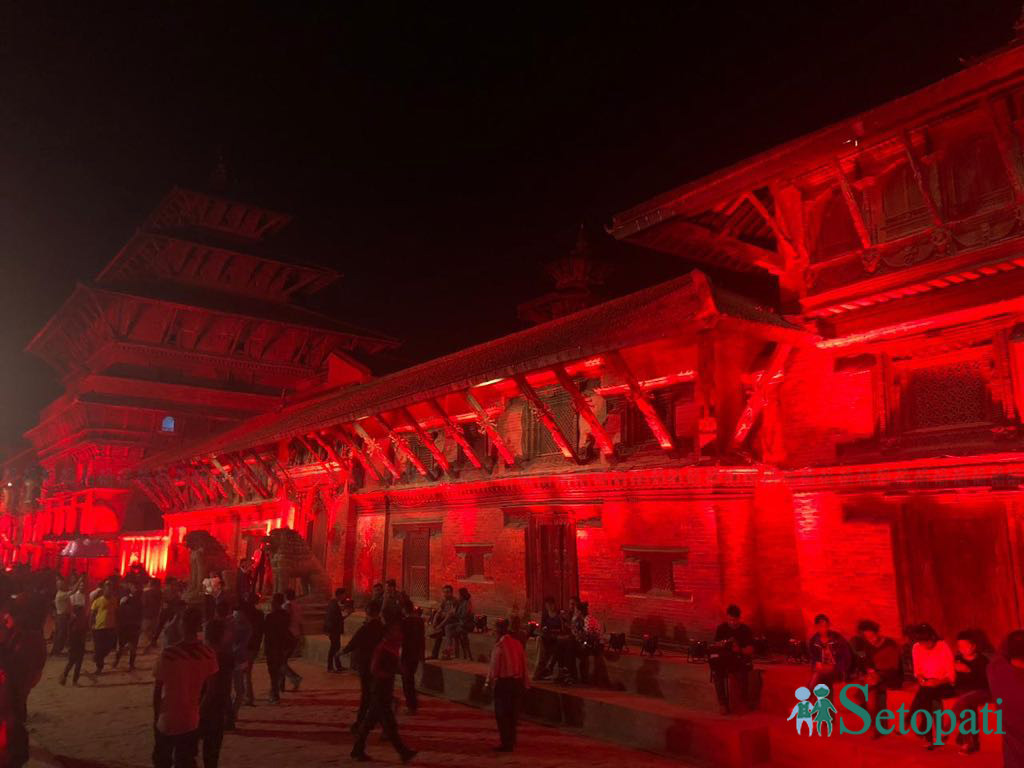 पाटन दरबार स्क्वायरमा यही असोज २० गते पोखिएको रातो प्रकाश। तस्बिरः कविन्द्र नकर्मी