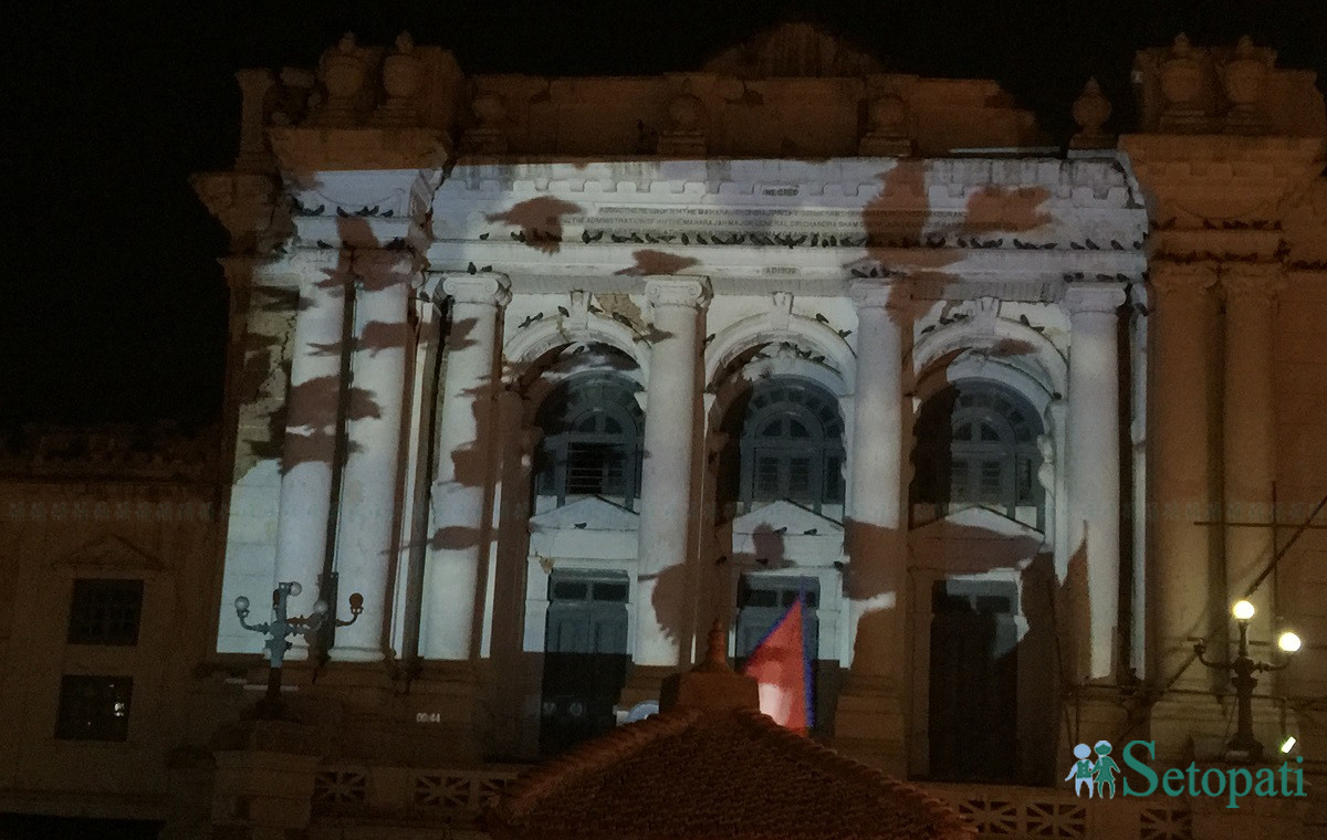 भुइँचालोमा भत्किएर भर्खरै पुनर्निर्माण भएको यो दरबारलाई हामी दिनकै सेतो रंगमा देख्छौं। त्यस दिन जग्गेमा बसेकी दुलहीझैं रातो रंगमा सिंगारिँदा फोटो खिच्नेहरूको लर्को लाग्यो। रातो पृष्ठभूमिमा थुप्रैले आफ्नै ‘सेल्फी’ पनि खिचे।