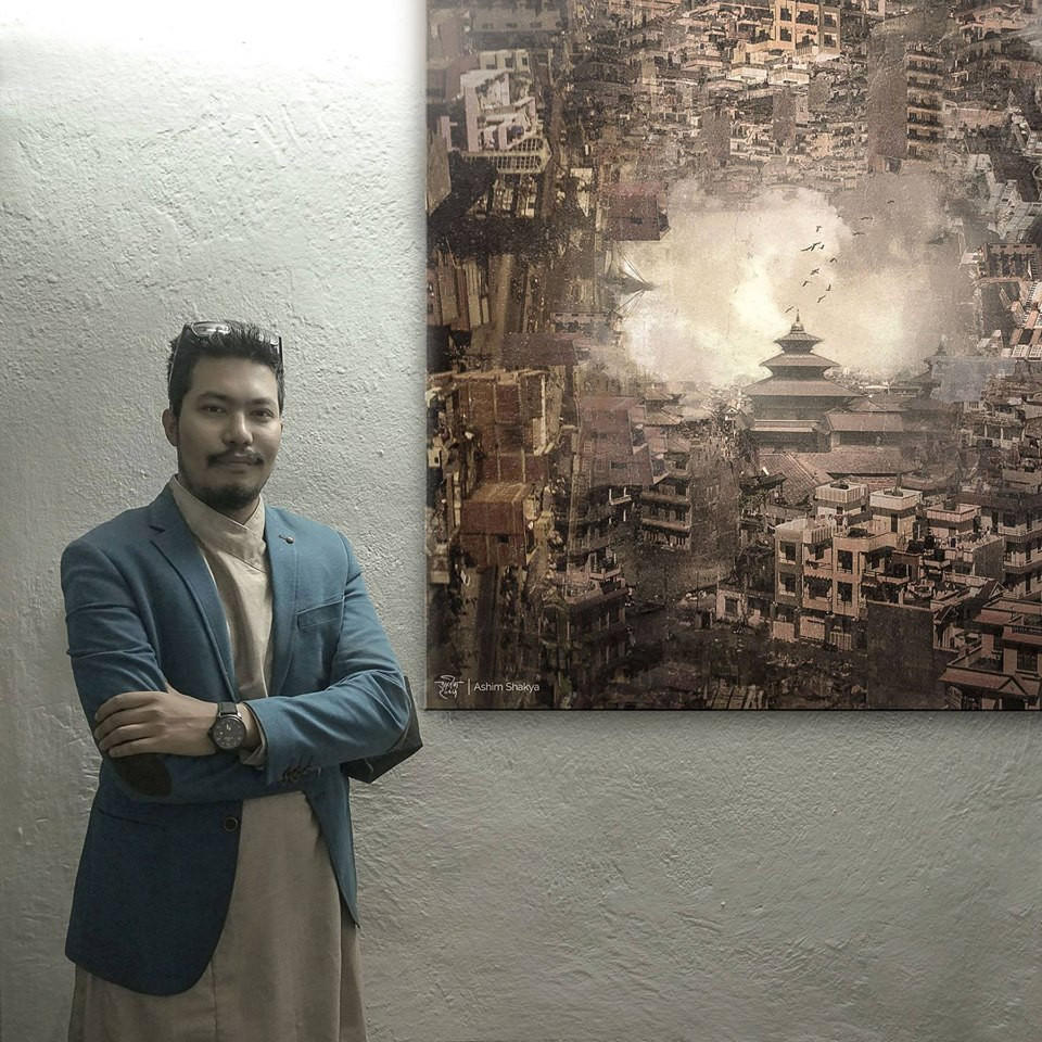 कलाकार अशीम शाक्य आफ्नो पेन्टिङका साथ। तस्बिर: अशीमको फेसबुक