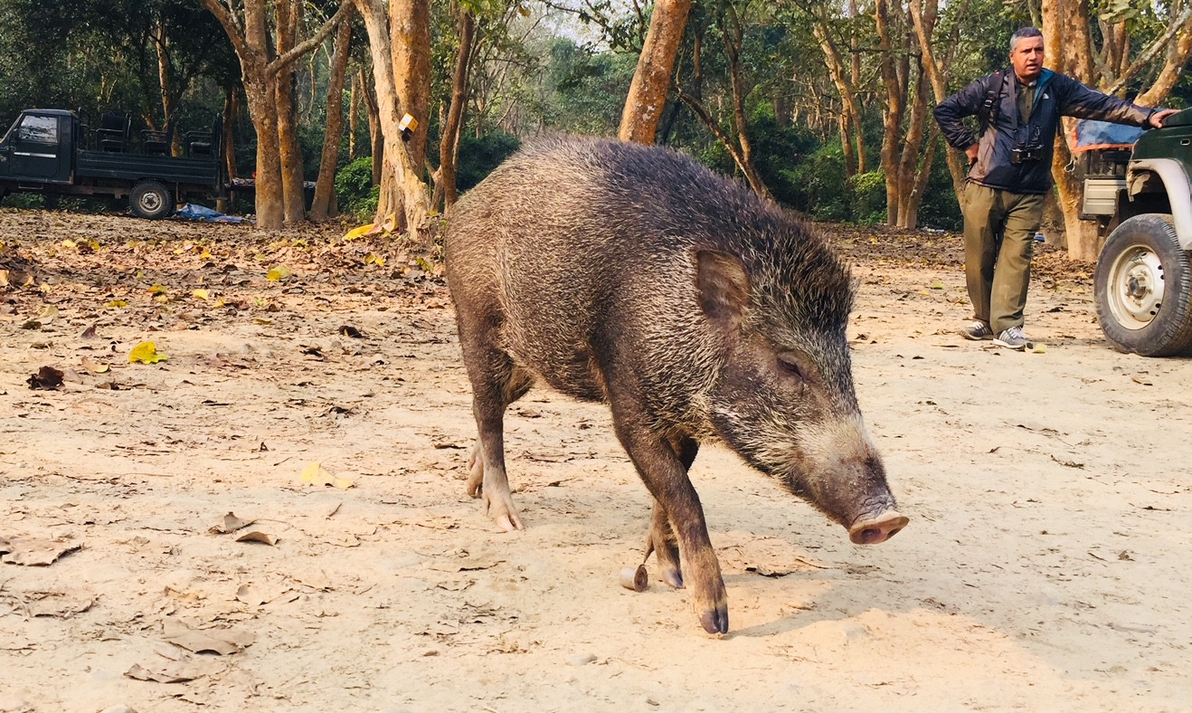 एकाबिहानै राप्ती खोला तरेर जंगल सफारी सुरु गर्नै लाग्दा हाम्रो जीप उभिएकै ठाउँनिर अचानक जंगली बँदेल आइपुग्यो। रूपमा बँदेल भए पनि व्यवहारमा सुँगुरजस्तो बढो आरामले ढल्किँदै नजिक आइरहेको थियो। छेउछाउ उभिएका विदेशी उत्तेजित हुन थाले।