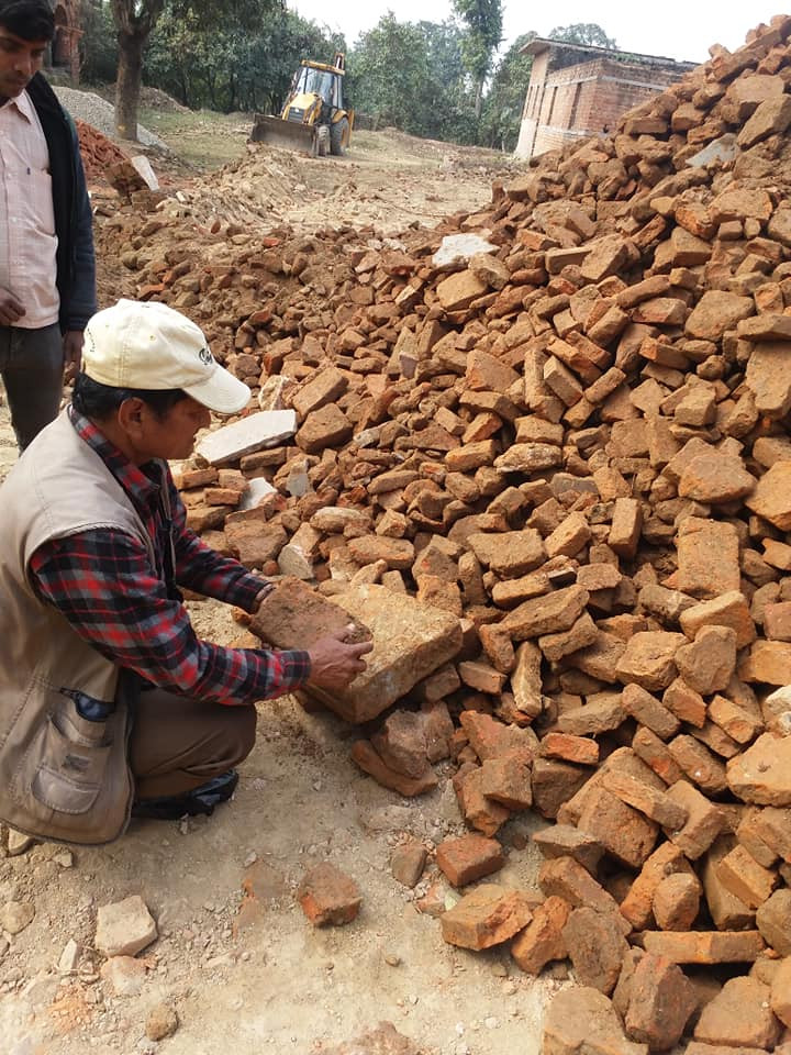 रानीबास मठमा डोजरले खनेर निकालिएका पुराना इँटा। तस्बिर: भरत साहको फेसबुकबाट