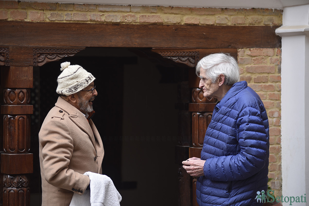 हार्वर्ड विश्वविद्यालयका संस्कृत प्राध्यापक माइकल विट्जेलसँग गौतमबज्र बज्राचार्य, ललितपुरमा। तस्बिरः नारायण महर्जन/सेतोपाटी
