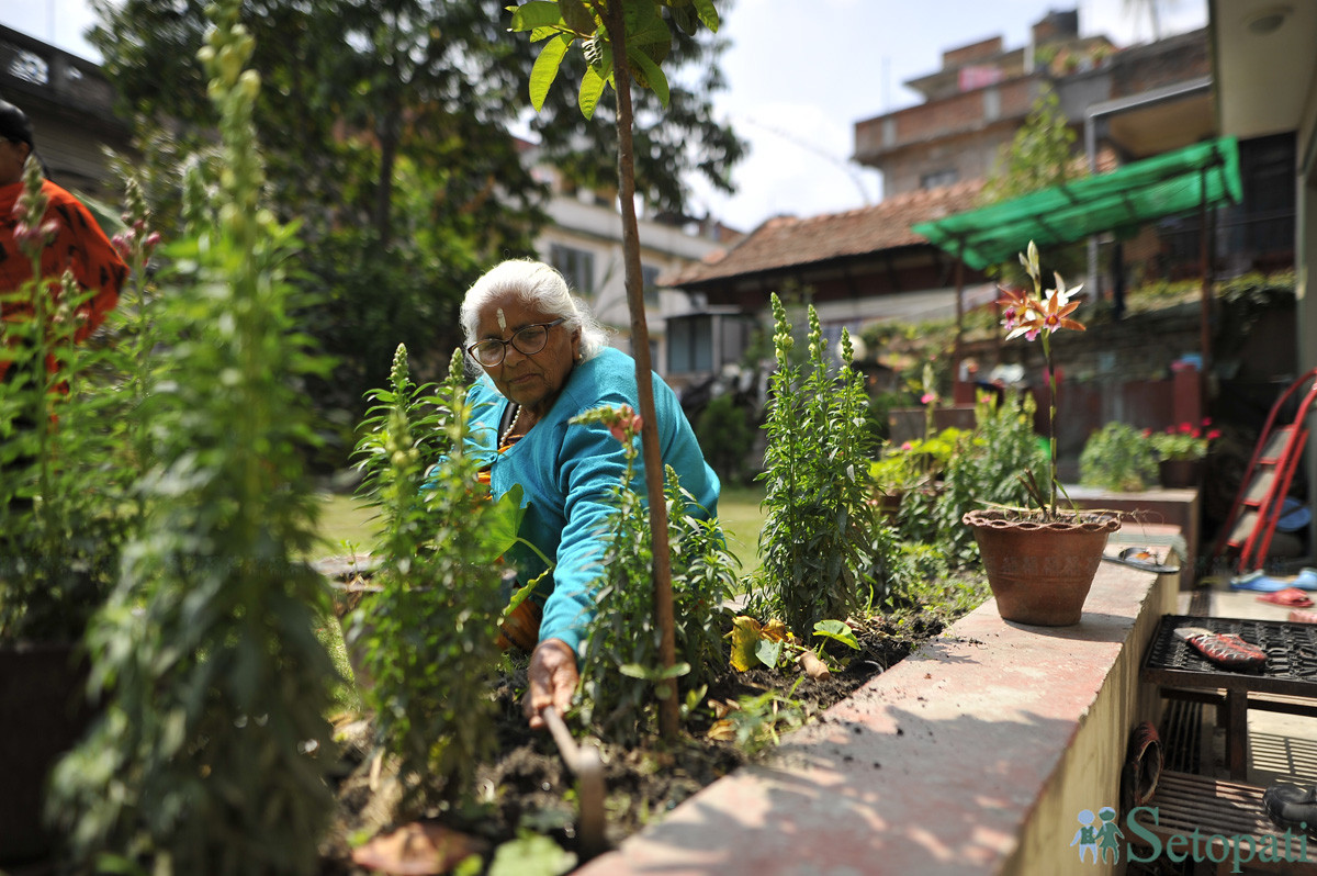 ८५ वर्षमा पनि मित्रकुमारी फूलबारीमा काम गर्न पछि हट्दिनन्। तस्बिरः नारायण महर्जन/सेतोपाटी