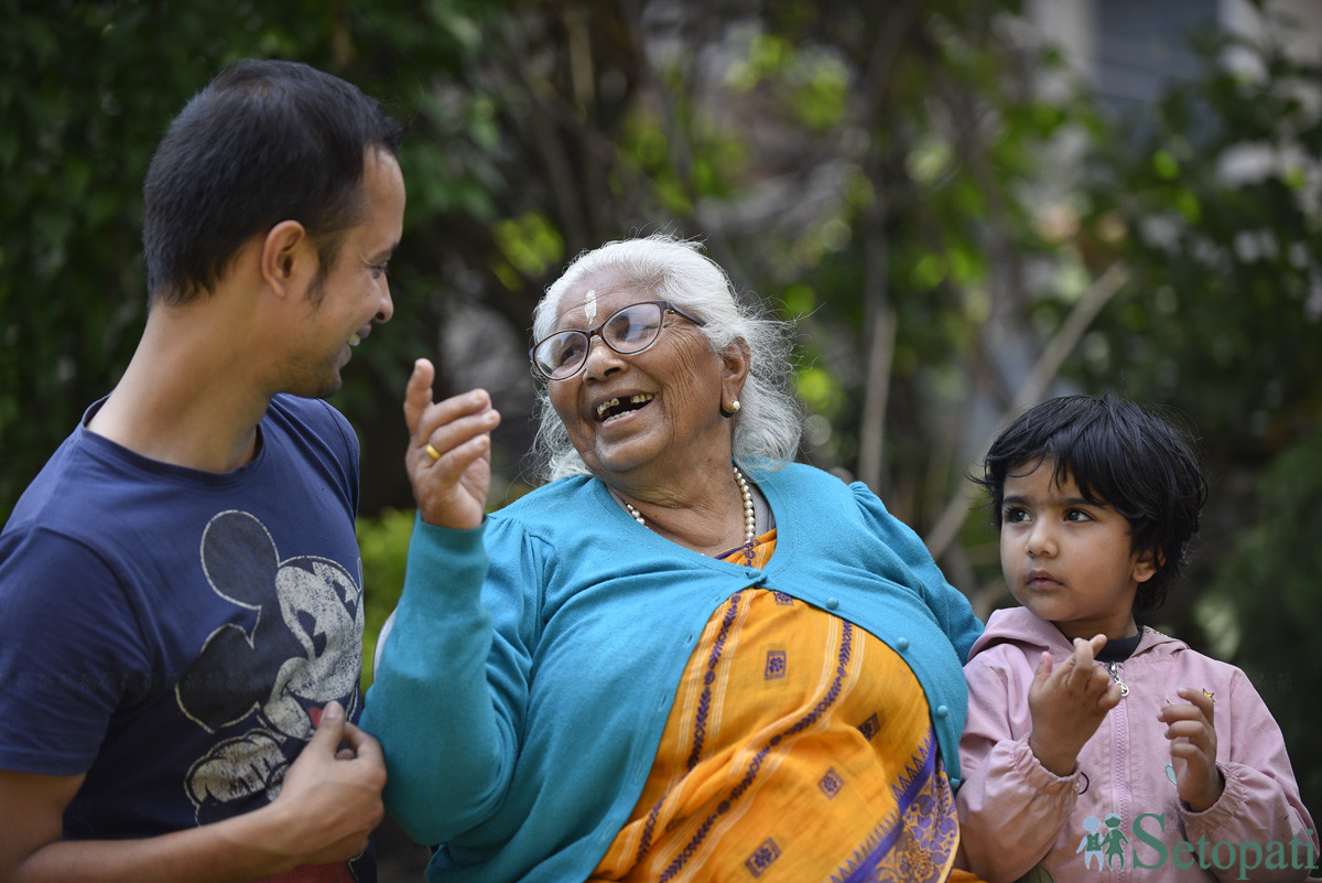 नाति र पनातिनीसँग गफिँदै मित्रकुमारी। तस्बिरः नारायण महर्जन/सेतोपाटी