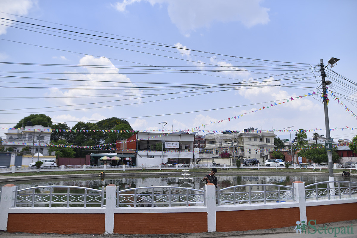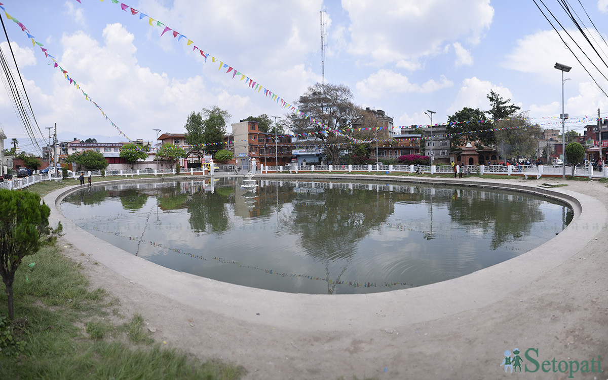 जात्रा त के भने, प्राचीन इतिहास बोकेको परम्परागत पोखरी वरिपरि जम्मै सिमेन्ट ढलान। त्यतिले नपुगेर बीचमा सेतो फाउन्टेन। साँझ बेला यहाँ पानीको फोहोरा छाडिन्छ। लहरै बत्ती बालेर पोखरी झलमल्ल पारिन्छ।