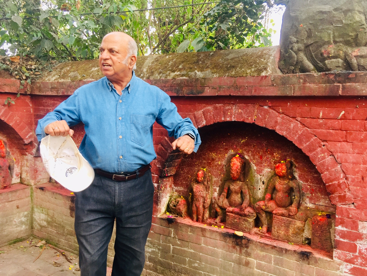 सत्यनारायण मन्दिरपछाडि किराँतकालीन देवीहरूका मूर्ति देखाउँदै तिवारी। तस्बिर: सुदीप श्रेष्ठ/सेतोपाटी