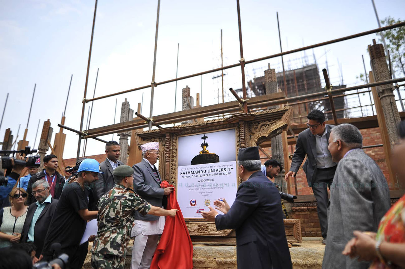 पुनर्निर्माणका क्रममा रहेको उक्त मौलिक र पुरातात्विक क्षेत्रको सम्पदा क्षेत्रमा शिल्पकारहरू काठमा विभिन्न आकृतिका बुट्टा कुँद्दै गर्दा प्रधानमन्त्री केपी शर्मा ओली पुगे। बिहान ११:१० बजे मन्दिर प्रवेश गरेका उनले २५ मिनेट बिताएर त्यहाँको पुनर्निर्माणको अवस्थाबारे जानकारी लिए।