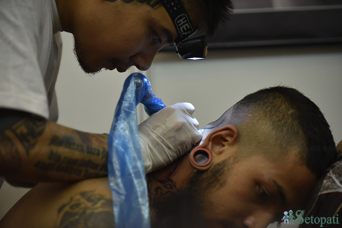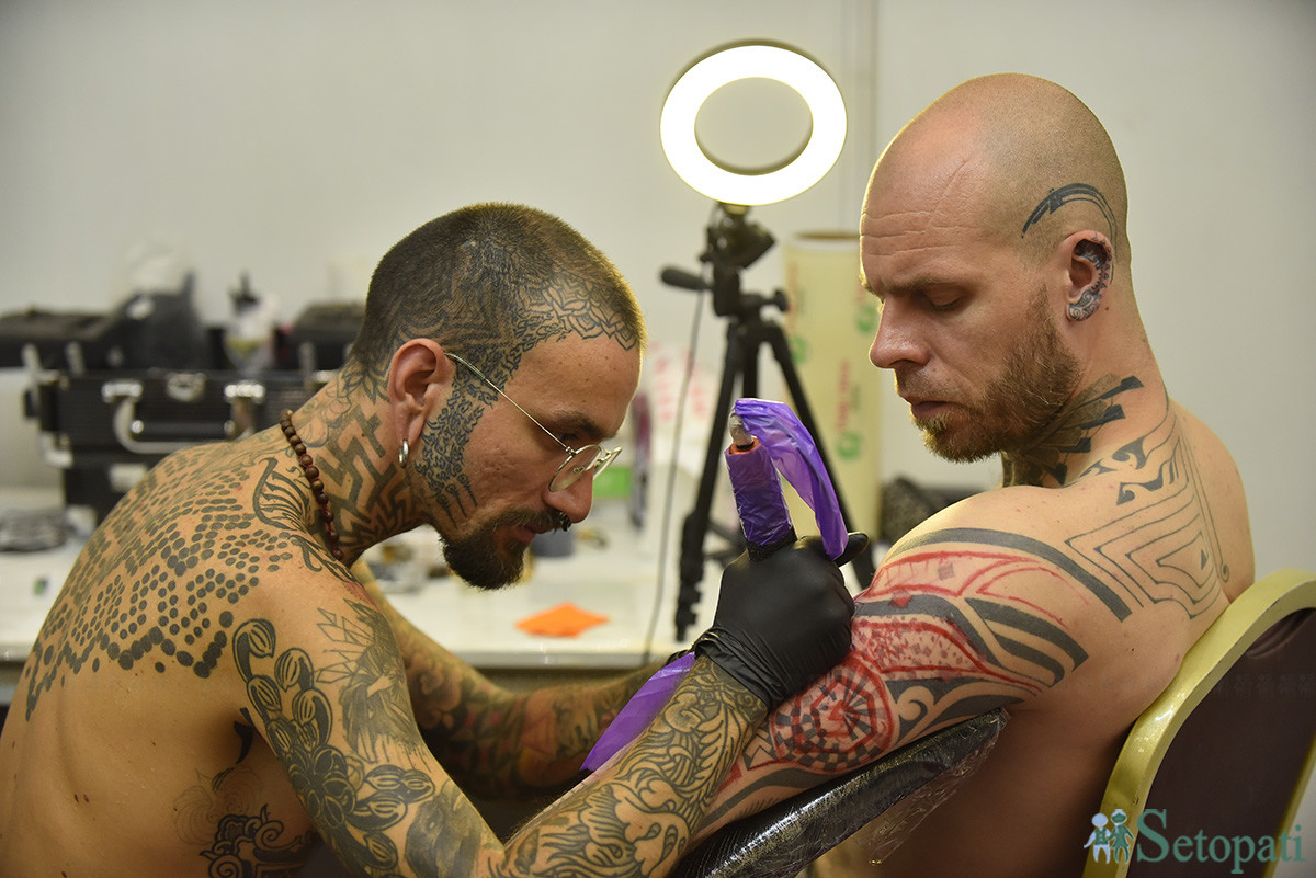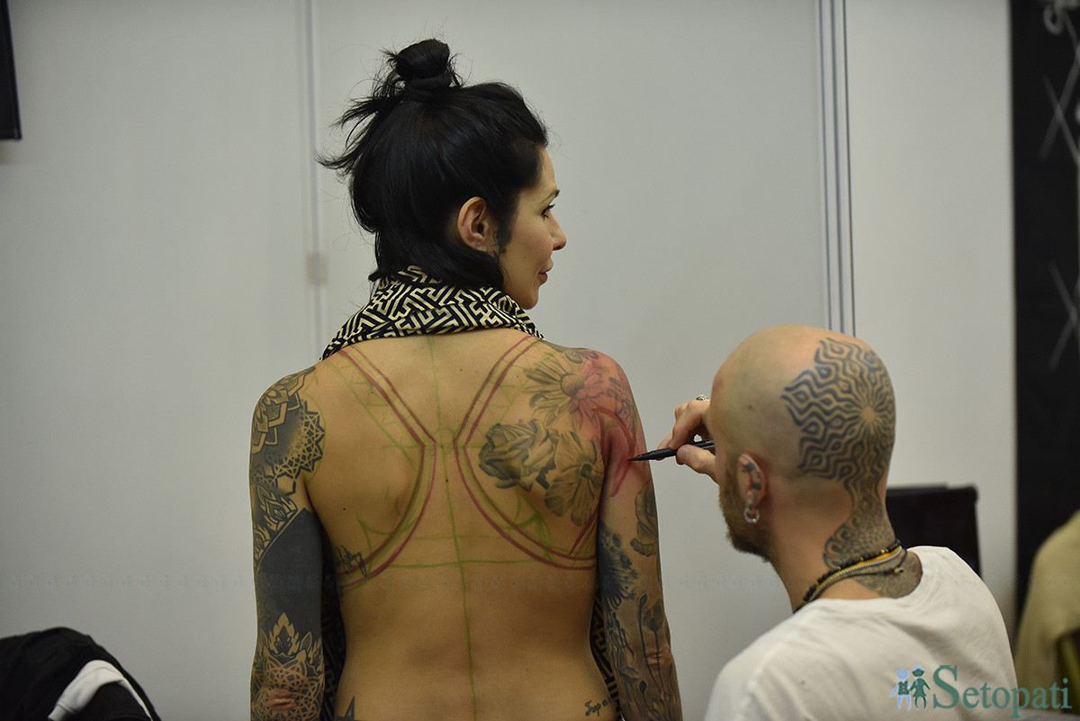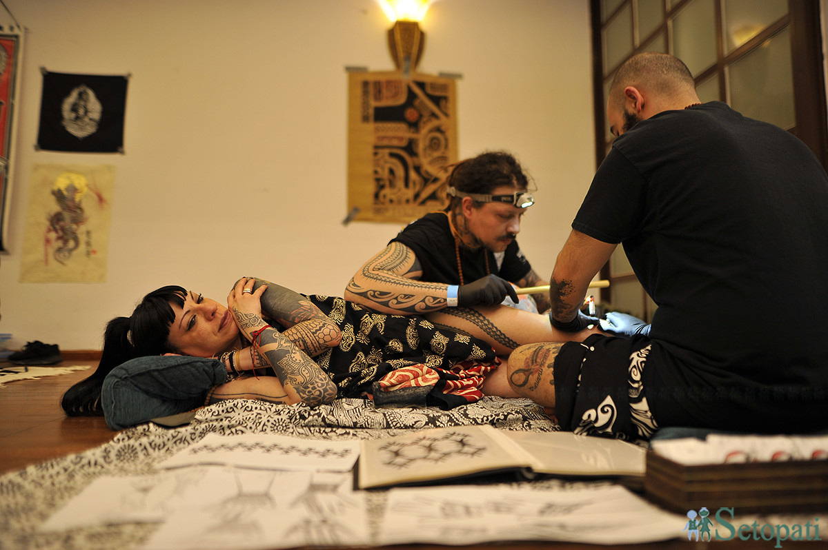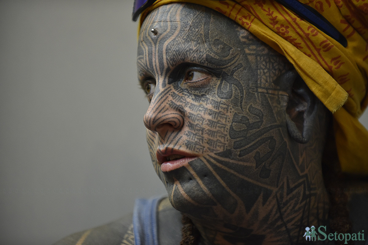 अनुहारमा ट्याटु खोपाएकी एक विदेशी नागरिक। तस्बिरः नारायण महर्जन