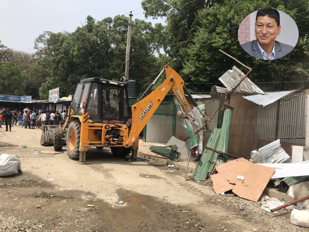 ‘उपमेयरको प्रतिवेदन आउन ढिला हुने भएकोले डोजर लगाएर सटर भत्काउनुपर्यो,’ मेयर शाक्यले भने। मेयर शाक्यले खुलामञ्चमा अनुमतिबिना बनेका सटर खाली गर्न उपमेयरलाई जिम्मेवारी दिए पनि उनले अटेर गर्दा भत्काउन समय लागेको पनि दाबी गरे।