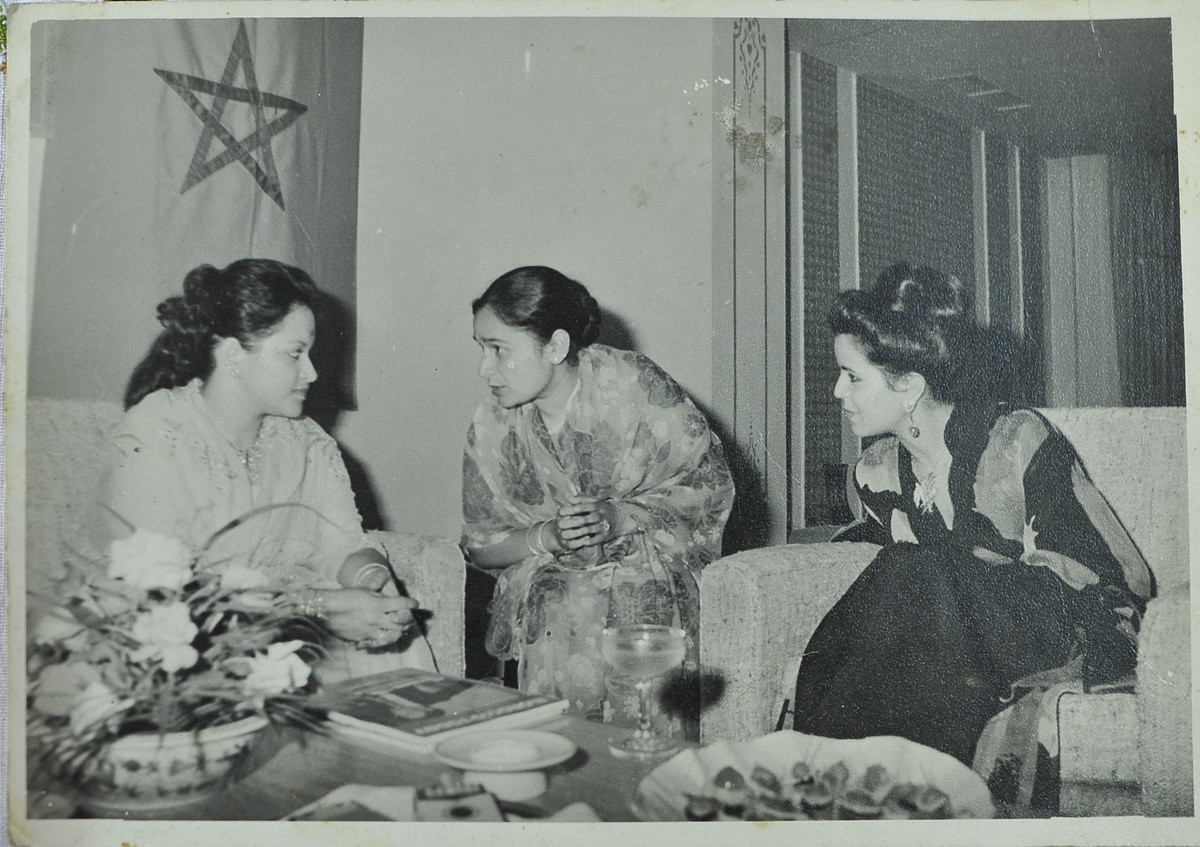 प्रेक्षा राज्यलक्ष्मी शाह (बायाँ) र मोरक्कोका राजदूतकी श्रीमती (दायाँ) सँग भगवती (बीचमा)। तस्बिरः भगवतीको पारिवारिक संकलन