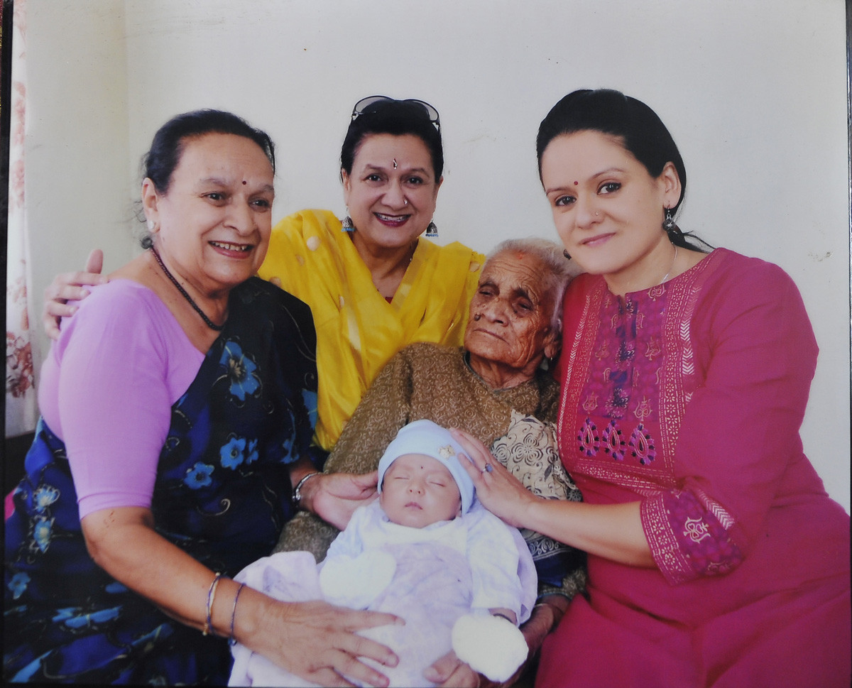 भगवती, उनकी आमा, छोरी, नातिनी र पनाति गरी पाँच पुस्ता। तस्बिरः भगवतीको पारिवारिक संकलन