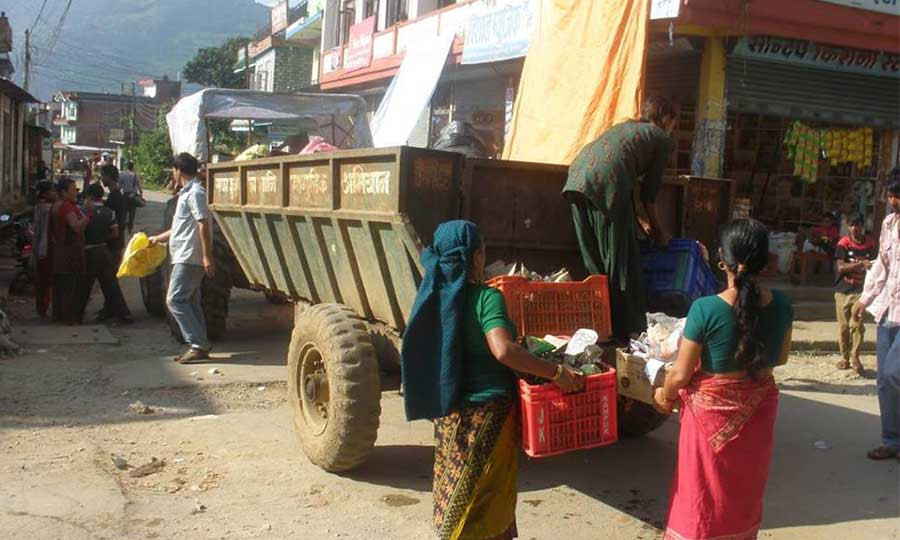 बजारका घरबाट उठाइएको फोहोर पाँच किलोमिटर टाढाको फोहोर व्यवस्थापन स्थलमा लगिन्छ।