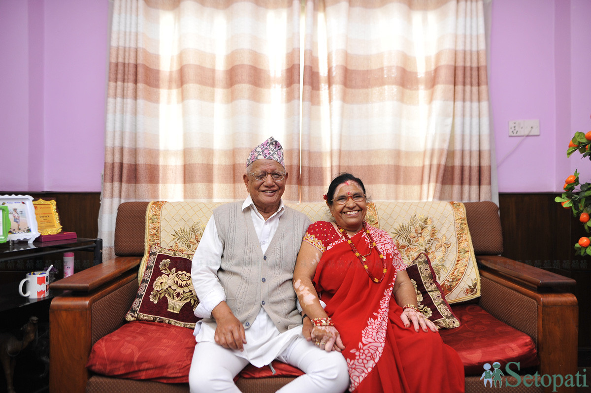 शान्ता वैद्य आफ्ना श्रीमान् विद्यानन्दको ९१ वर्षको जन्मदिनमा। तस्बिर: नारायण महर्जन/सेतोपाटी