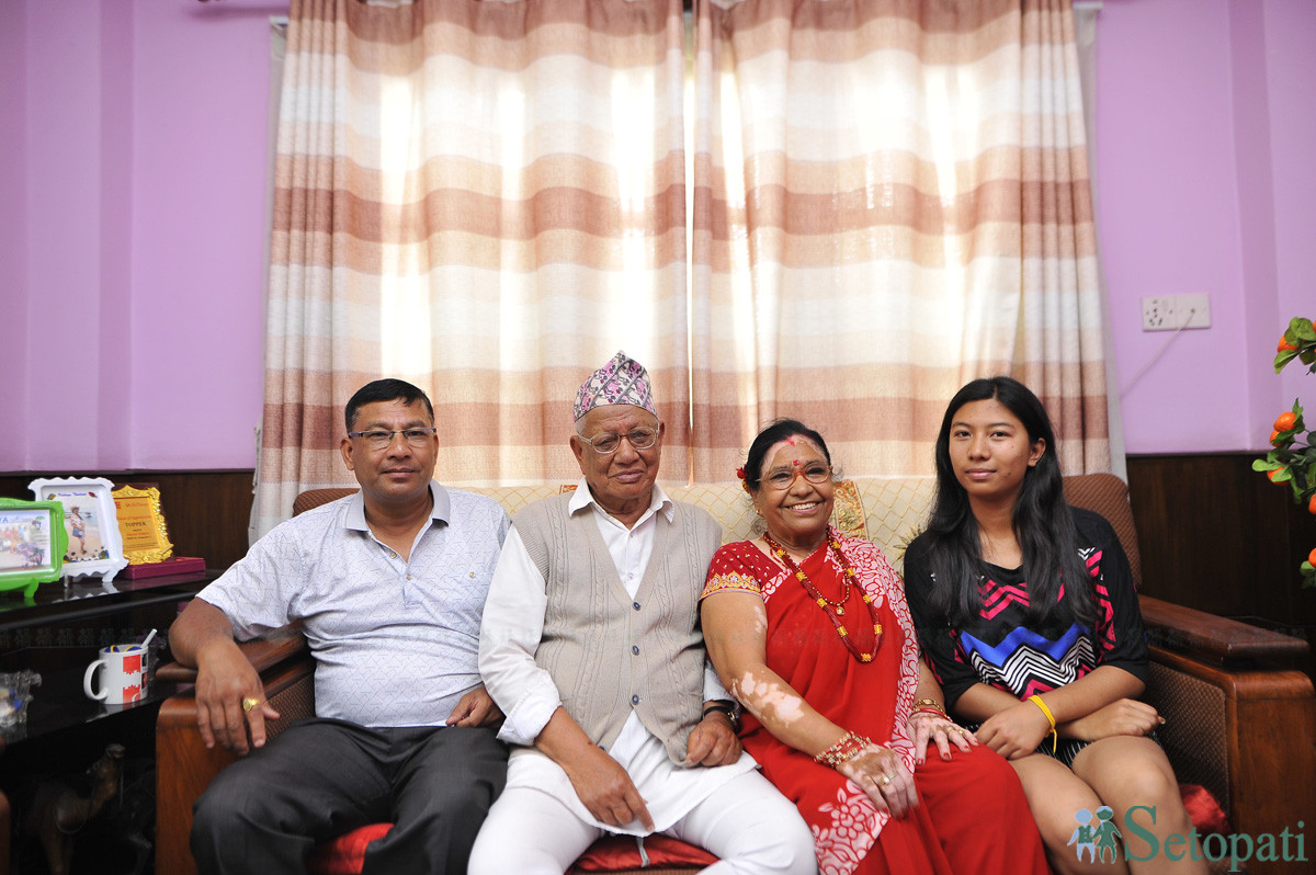 शान्ता वैद्य र उनका श्रीमान कान्छा छोरा र नातिनीसँग। तस्बिर: नारायण महर्जन/सेतोपाटी