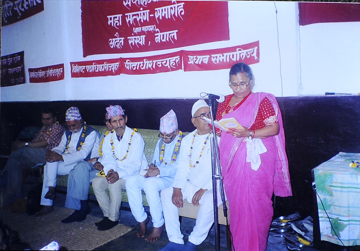 अद्वैत संस्थामा गुरू वन्दना पाठ गर्दै शान्ता वैद्य। तस्बिर: पारिवारिक संकलन