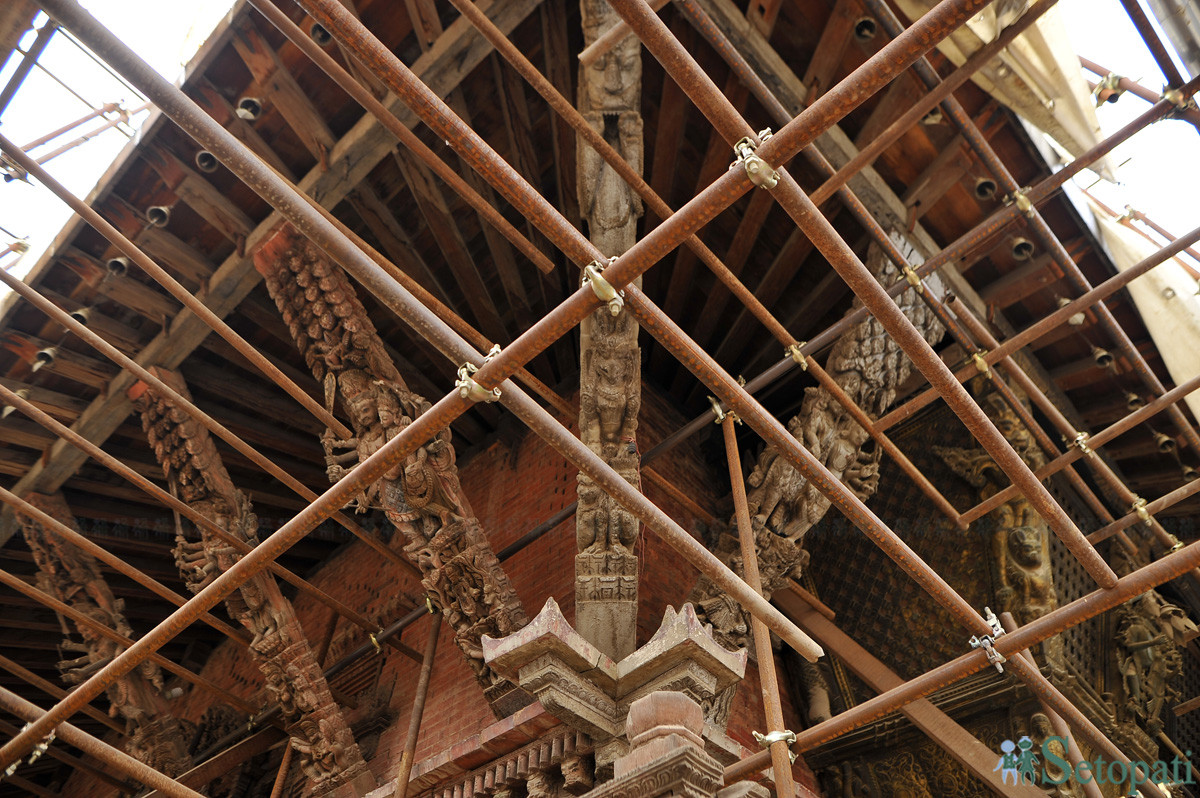 'मन्दिरको पूर्वी भाग थेगेको खाँबो धागो राखेर हेर्दा लगभग आठ इन्च बाहिर धकेलिएको पायौं,' प्राविधिक जिम्मेवारी सम्हालिरहेका डा. रोहित रञ्जितकारको भनाइ सुनाइयो, 'त्यसैगरी चिरा परेको प्वाल मुठ्ठी नै पस्ने गरी चौडा भइसकेका छन्।'