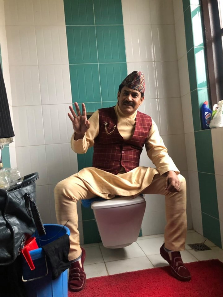 ट्वाइलेटको कमोडमा बसेका अभिनेता खनाल।