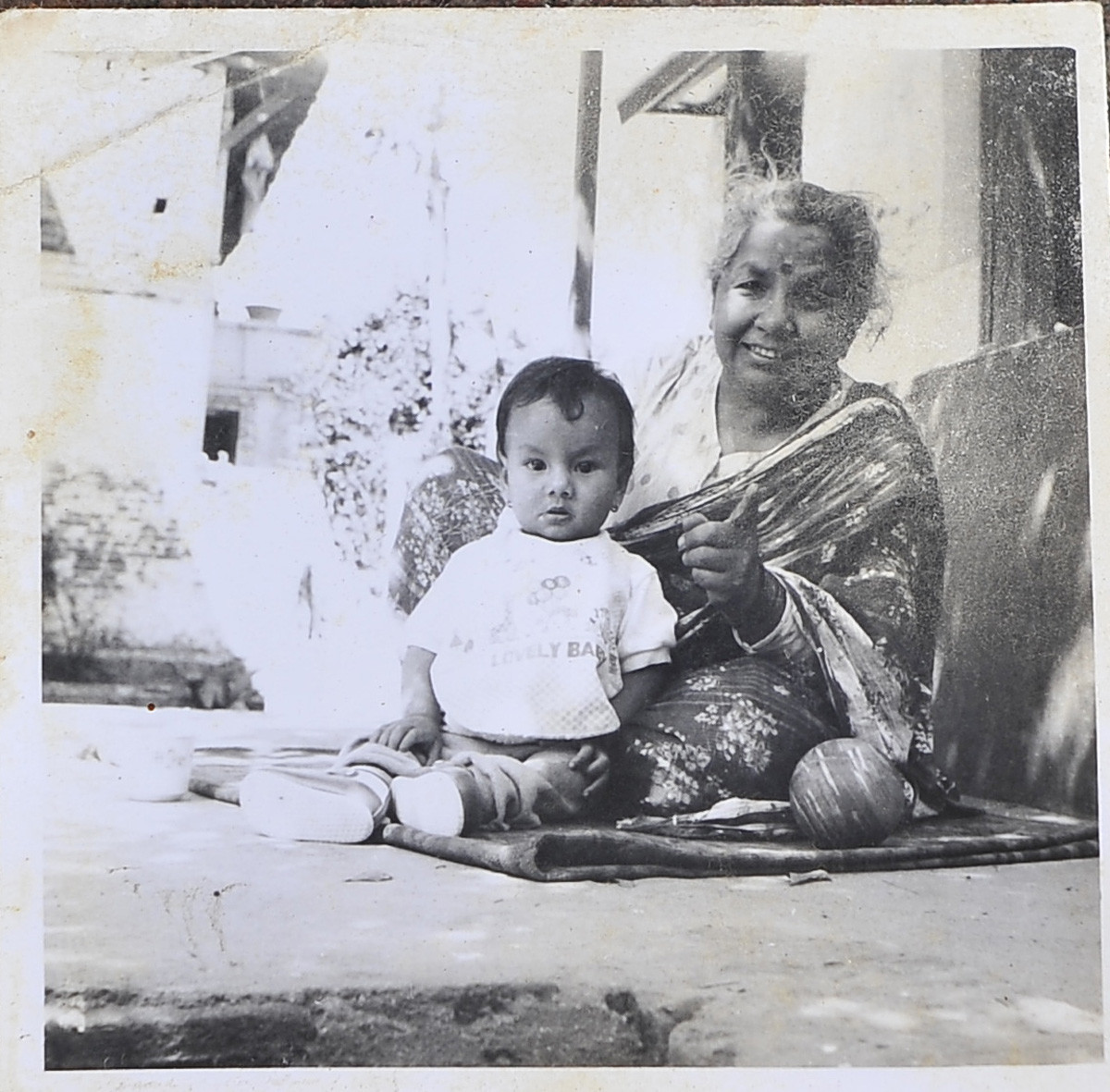 राधादेवी आफ्ना नातिसँग। तस्बिरः राधादेवीको पारिवारिक संकलन