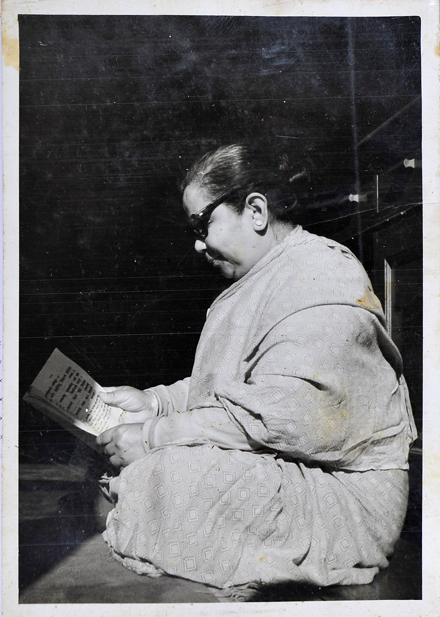 राधादेवी 'अष्टसाहस्रिका प्रज्ञापारमिता' पाठ गर्दै। तस्बिरः राधादेवीको पारिवारिक संकलन