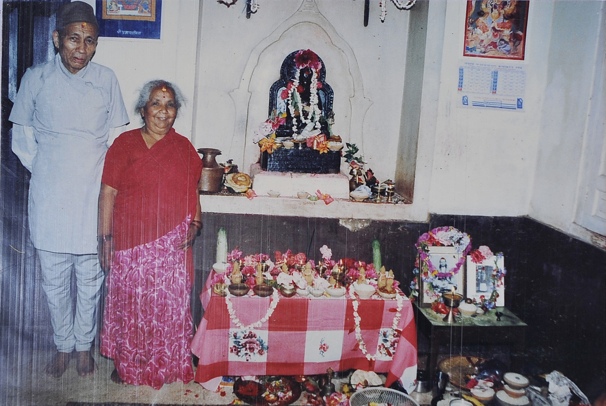 घरमा पूजापछि फोटो खिचाउँदै राधादेवी र उनका श्रीमान सत्यमोहन जोशी। तस्बिरः राधादेवीको पारिवारिक संकलन