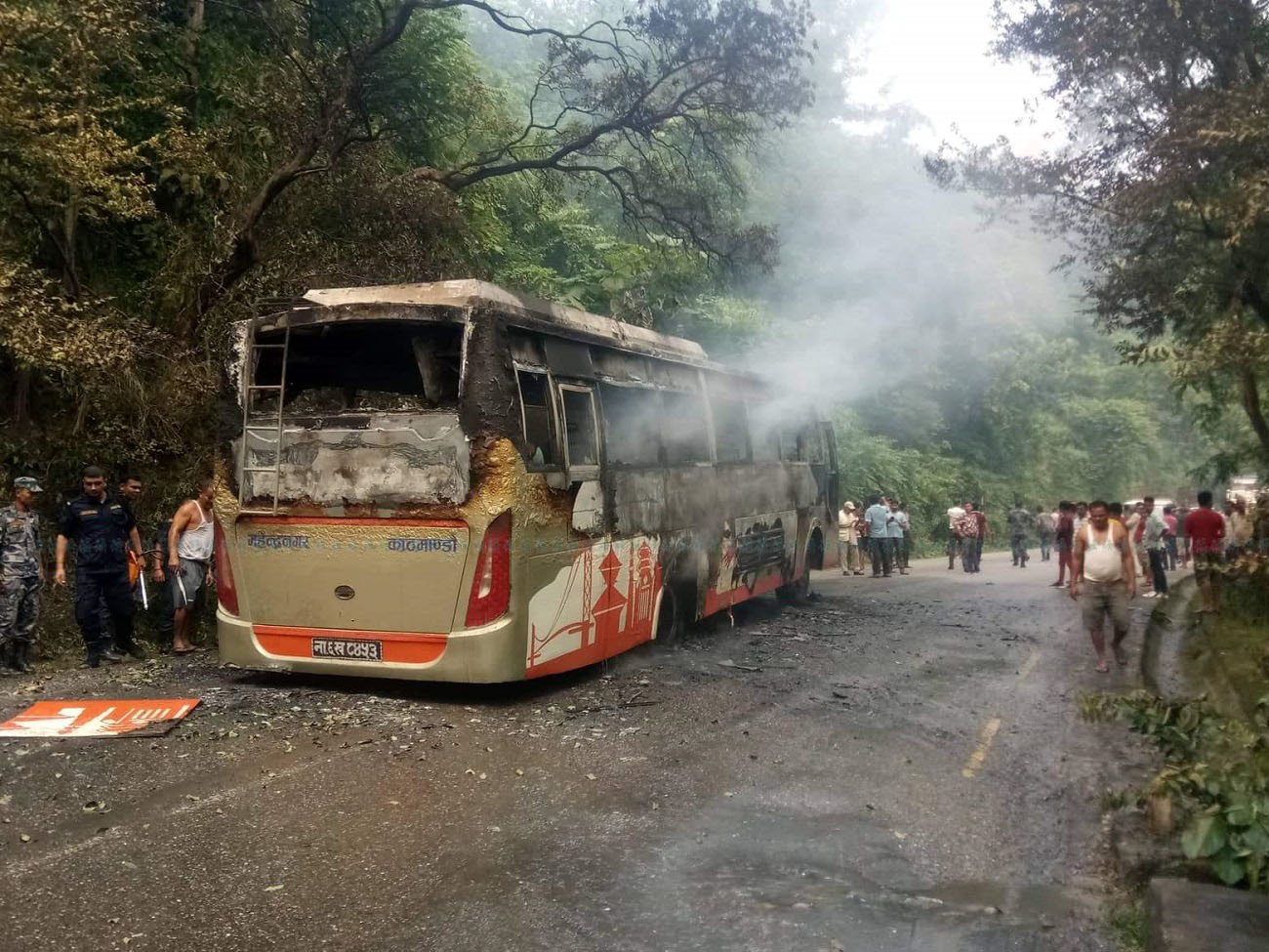 ‘त्यहाँबाट आउँदै गरेको बस दाउन्ने पुगेर बिग्रिएको र यात्रुहरूलाई अर्को गाडीमा राखेर पठाएको थियो। पछि खाली गाडी बिग्रिएर बनाउन लग्ने क्रममा इन्जिन सर्ट भएर आगलागी भएको हो’, डिएसपी थापाले भने।
