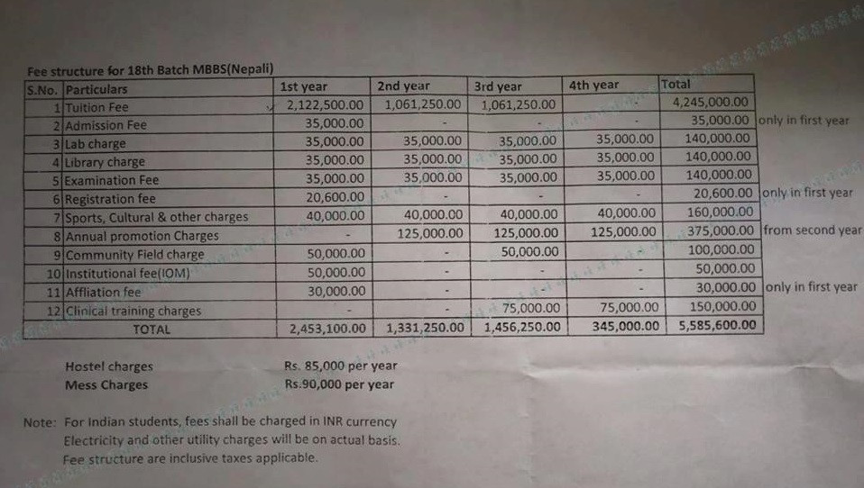 नेशनल मेडिकल कलेजले तयार पारेको अतिरिक्त शुल्कको सूची सेतोपाटीलाई विद्यार्थीले उपलब्ध गराएका छन्। जसअनुसार उसले ५५ लाख ८५ हजार ६ सय रुपैयाँ १८ औं ब्याचका लागि निर्धारण गरेको देखिन्छ।