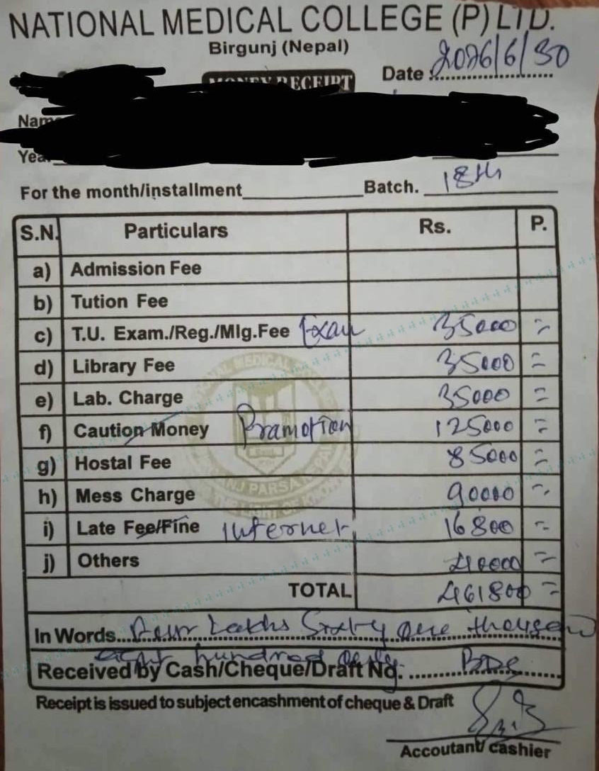 नेसनल मेडिकल कलेजले परीक्षा, रजिष्ट्रेसनबापत ३५ हजार रुपैयाँ उठाएको छ।