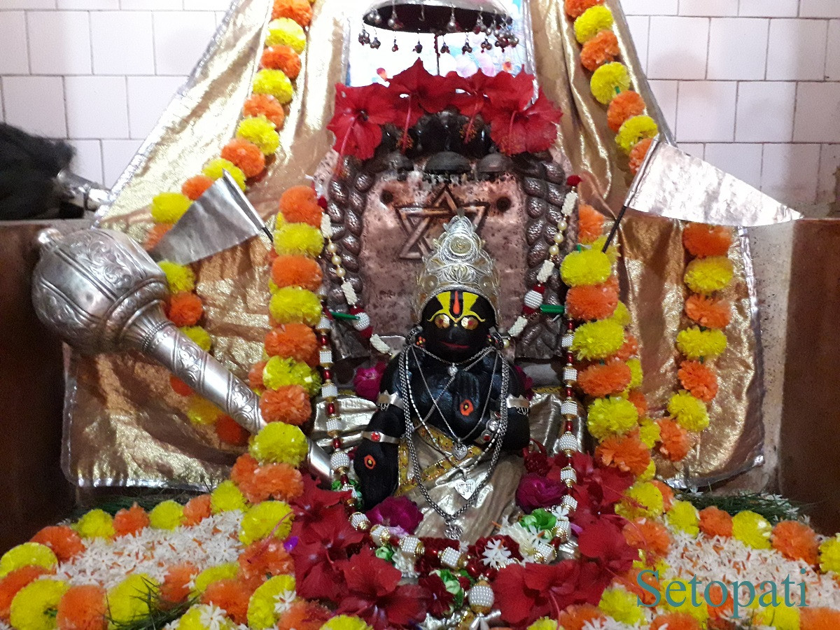 हामीले देख्दा सुनौलोमा नीलो किनार भएको झिलीमिली लुगा लगाएका, गरगहना र श्रृंगारमा सजिएका हनुमानको रूप दैनिक फेरिने रहेछ।