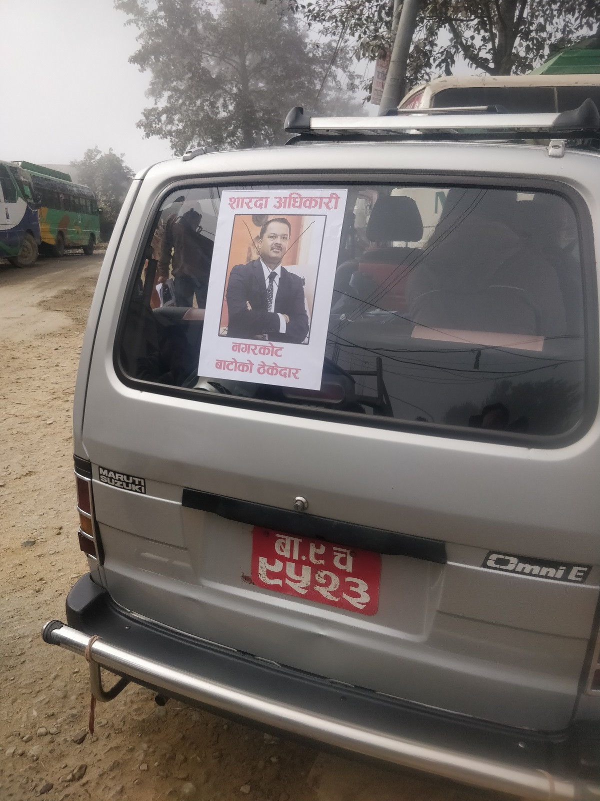 हो यस्तै नगरकोटमा पनि एक जना व्यक्तिको तस्बिर जताततै टाँगिएका छन्। त्यो अरु कसैको नभइ सैलुङ कन्स्ट्रक्सनका प्रमुख शारदाप्रसाद अधिकारीको हो।