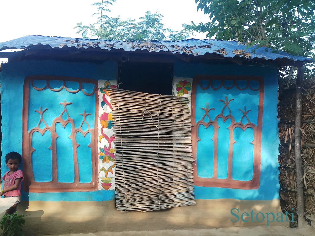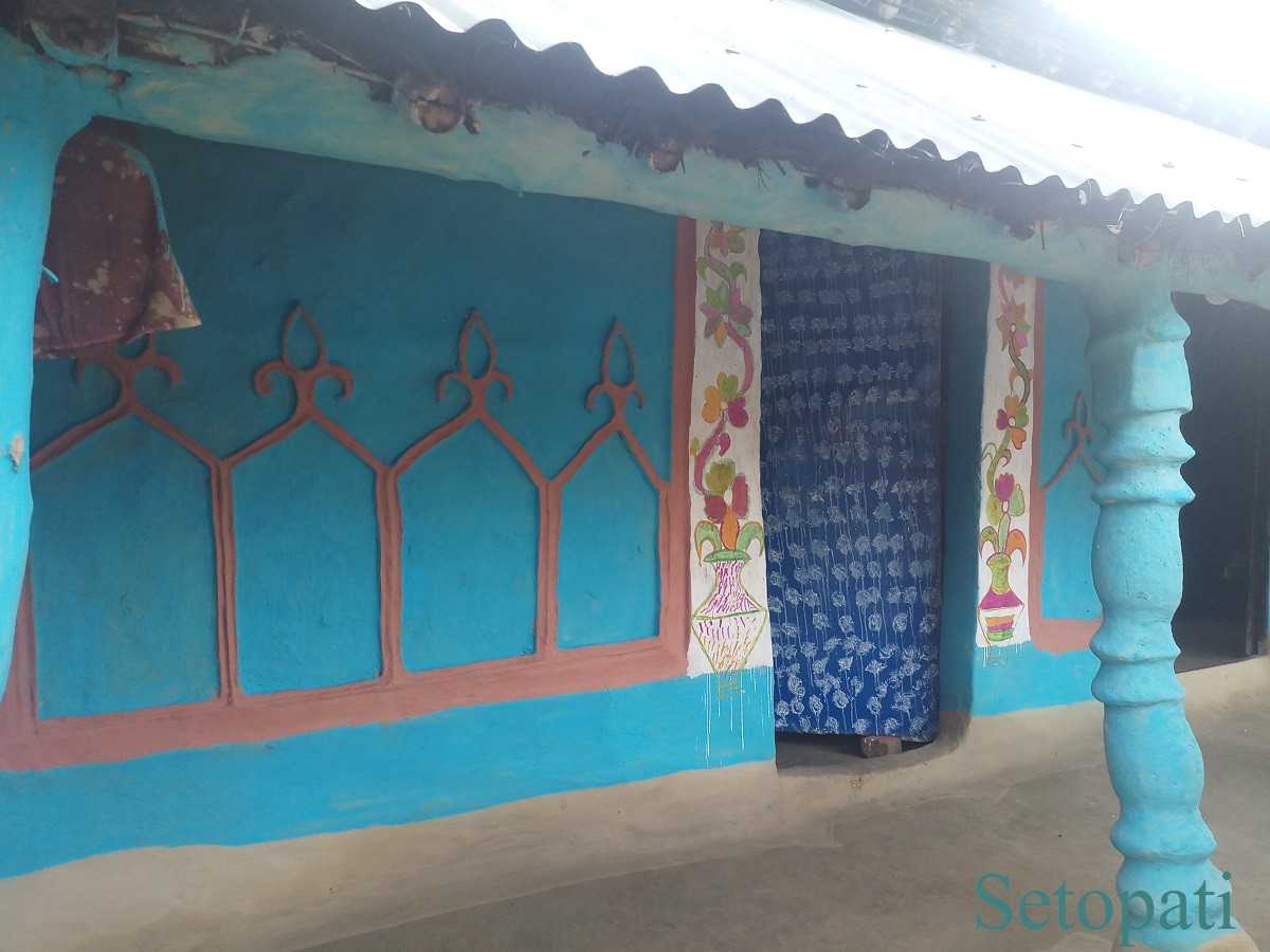 भारदह हिँडेका हामी जोगिनियाको त्यस्तै घरमा पुग्यौं, जहाँ भित्ताको एकपत्र माटोले बुट्टा कुँदिएका थिए। कमलको फूल, चरा- यस्तायस्तै आकृति।