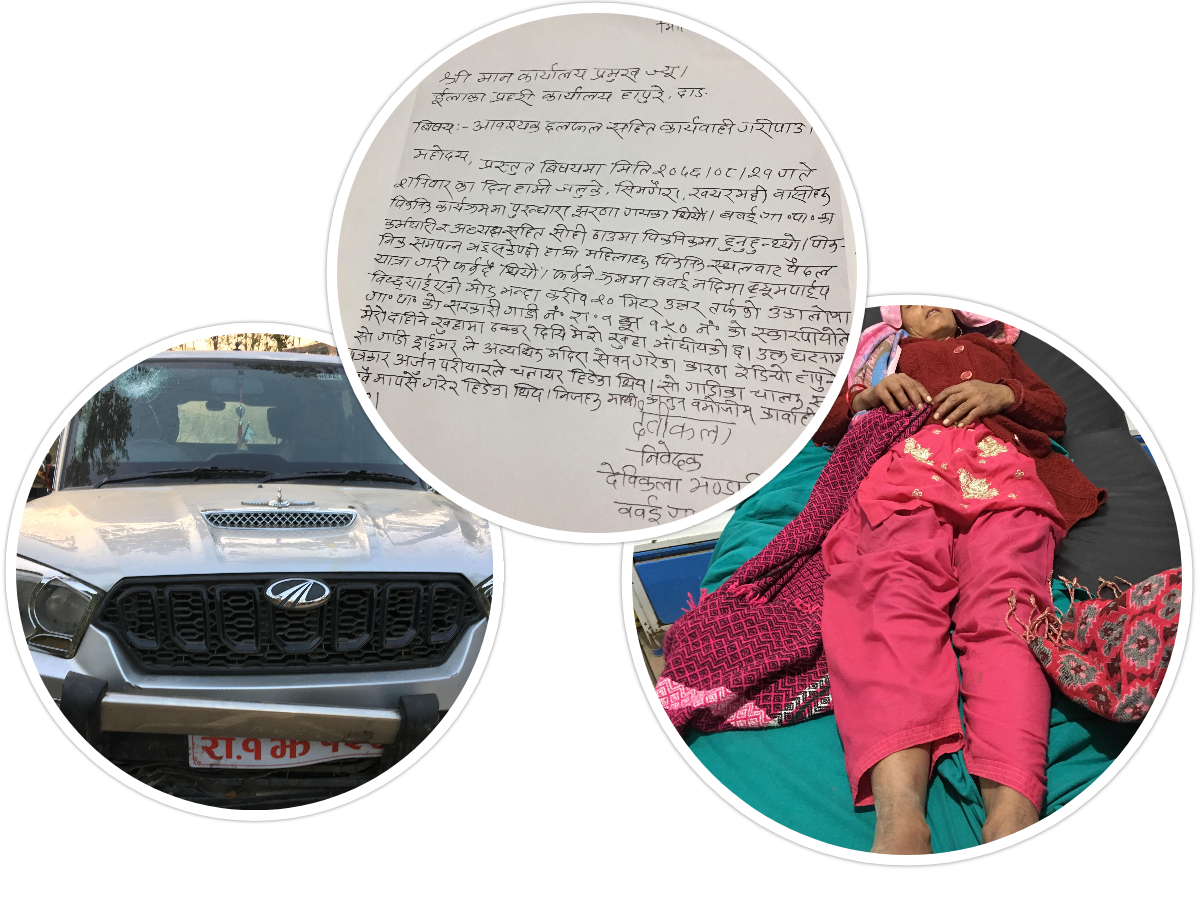 गाउँपालिकाको रा१झ १५० नम्बरको सरकारी गाडीले बबई-५ की देवीकला भण्डारीलाई घाइते बनाएको हो। भण्डारीको दाहिने खुट्टा गाडीको टायरले किचिदिएको छ।