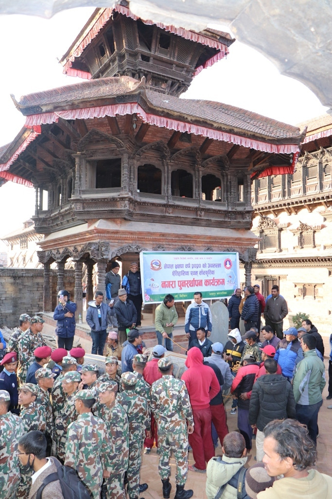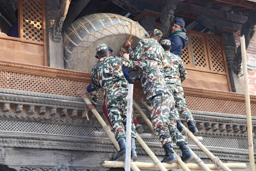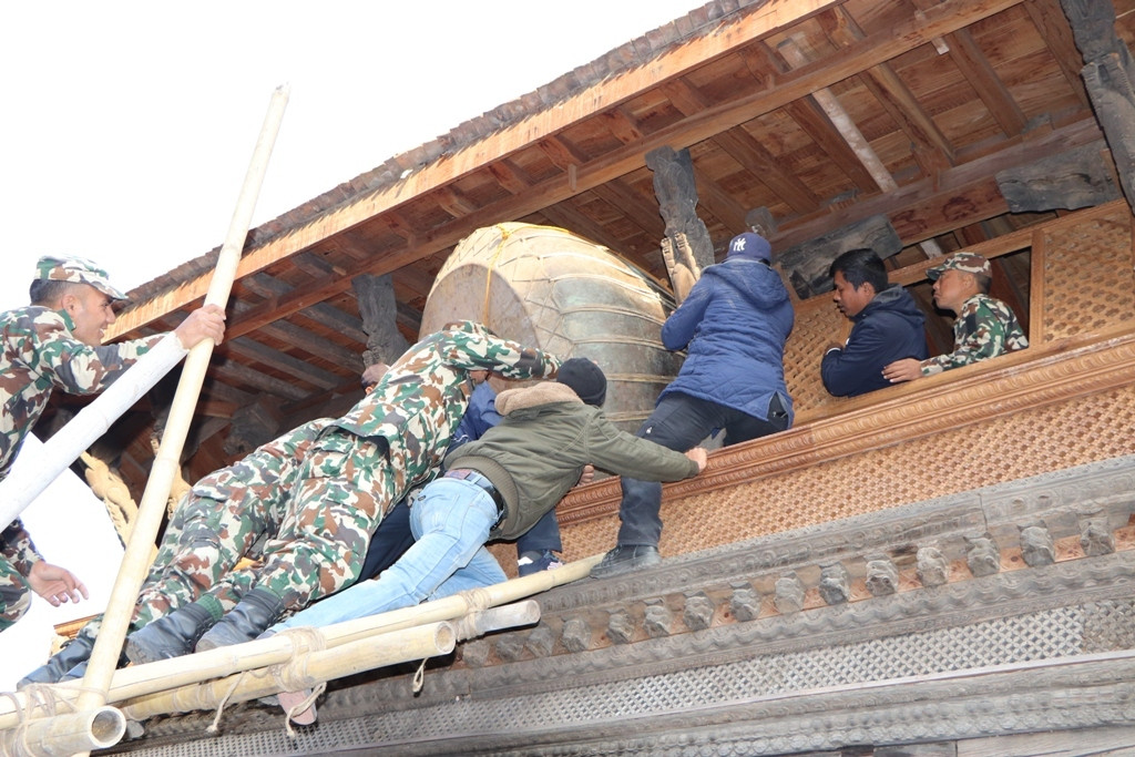 नगरा पुनः स्थापना गरिँदै। तस्बिर सौजन्यः भक्तपुर नगरपालिका