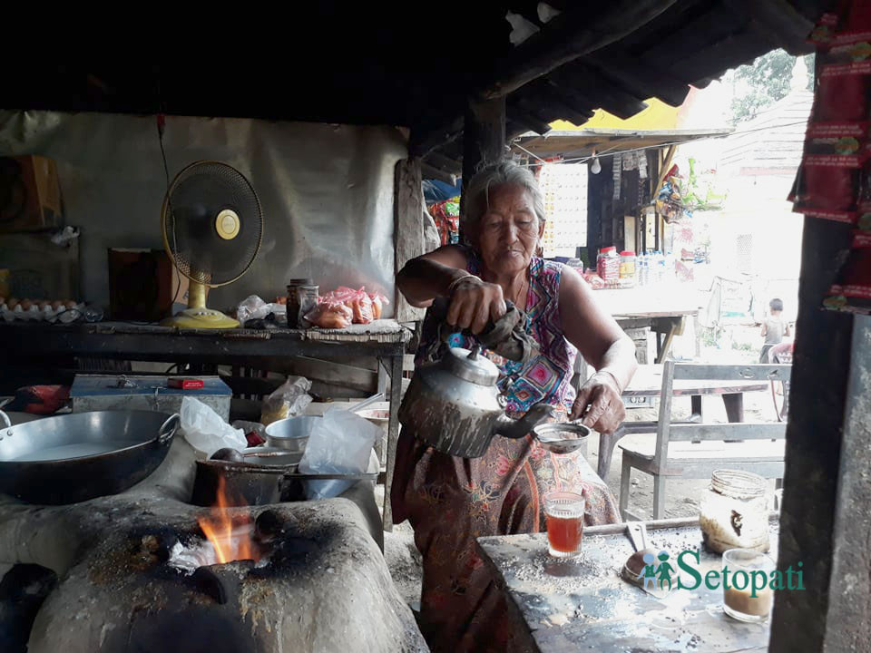 उनी बूढी छिन्। सबैले आमा भन्छन्। अनि उनको पसलको नाम नै आमाको चिया पसल छ।