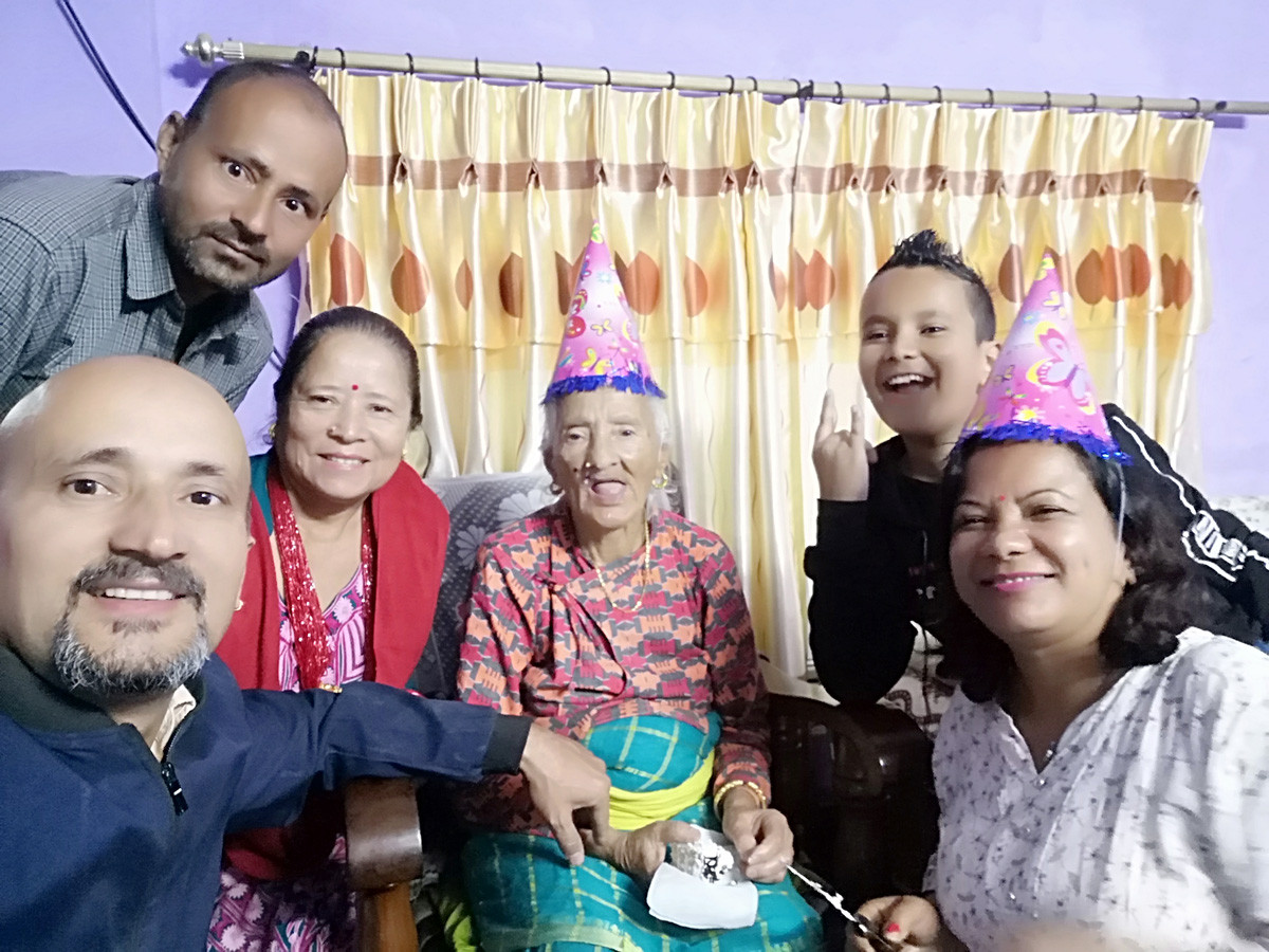 टंकमाया कार्की परिवारसँग जन्मदिन मनाउँदै। तस्बिरः टंकमायाको पारिवारिक संकलन