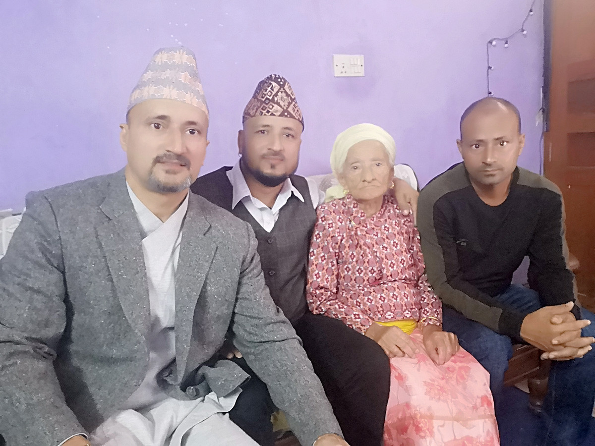 टंकमाया आफ्ना दुई छोरा र नातिसँग। तस्बिरः नारायण महर्जन/सेतोपाटी