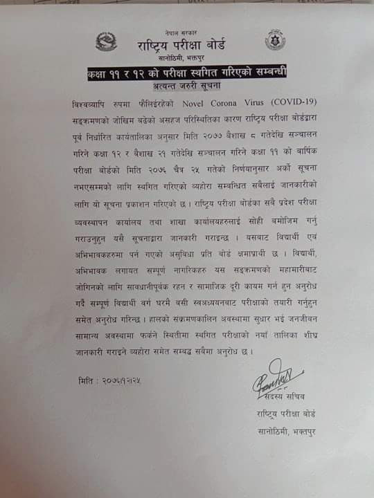 मंगलबार बसेको परीक्षा बोर्डको बैठकले वैशाख २१ गतेदेखि हुने भनिएको कक्षा ११ को परीक्षा र वैशाख ८ गतेदेखि हुने भनिएको कक्षा १२ को परीक्षा अर्को सूचना जारी नहुञ्जेलका लागि स्थगित गर्ने निर्णय गरेको हो।
