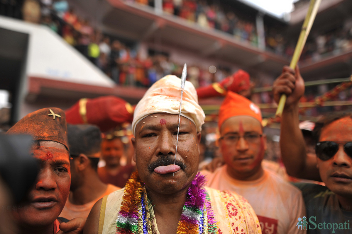 दुई वर्षअघि ठिमीको बोडेमा छैठौं पटक जीब्रो छेड्दै बुद्धकृष्ण। फाइल तस्बिर: नारायण महर्जन/सेतोपाटी