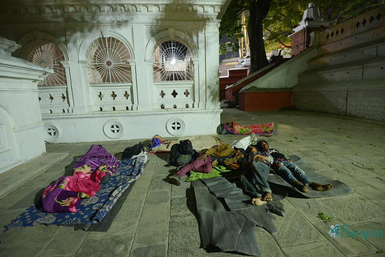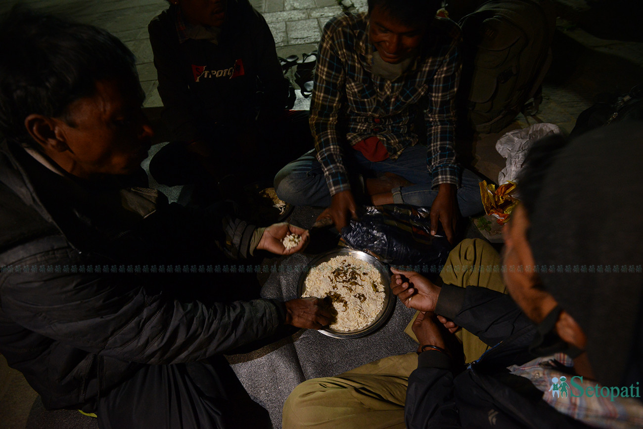 आ-आफ्नै बोराका सिरानी बनाउँदै कम्बल निकाले र घप्लक्क सुते। आकाश चौधरी भने सुन्निएका खुट्टामा तेल घस्न थाले। निक्कै दुखेको छ भन्दै थिए।