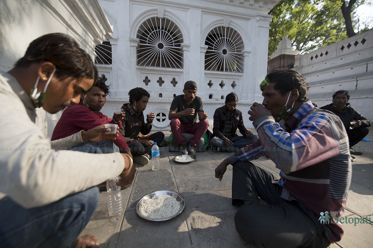 मन्दिरकै भागवत सन्यास आश्रम गुरुकुलका एक गुरूले उनीहरूलाई चिया र चिउरा उपलब्ध गराइदिने भए। 'चिया नपिएको कति दिन भइसक्यो,' खाँदै गर्दा उनीहरूमध्ये एकले भने।