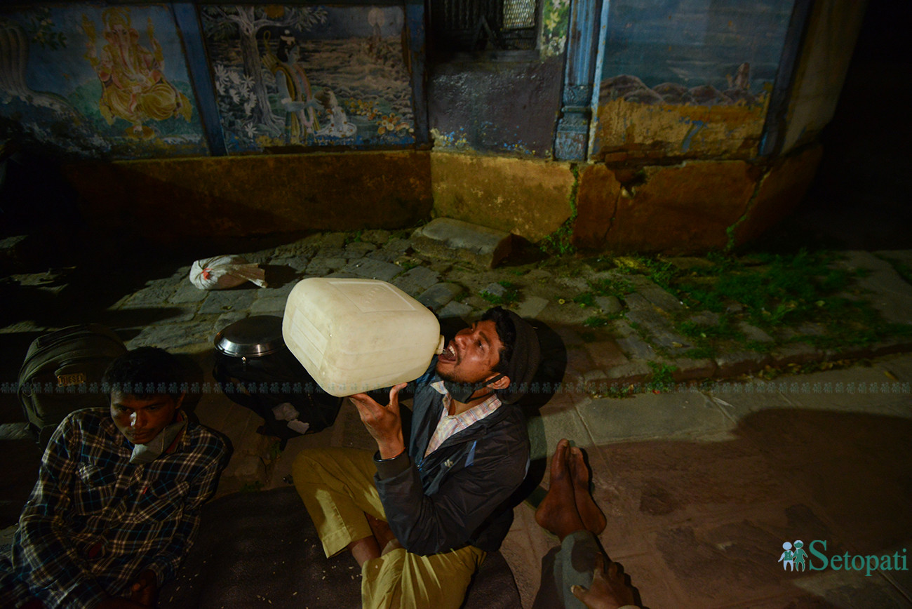 काठमाडौंको सडक छेउमा हात धुन राखिएको पानी बोतलमा भर्दै आशाराम चौधरी।