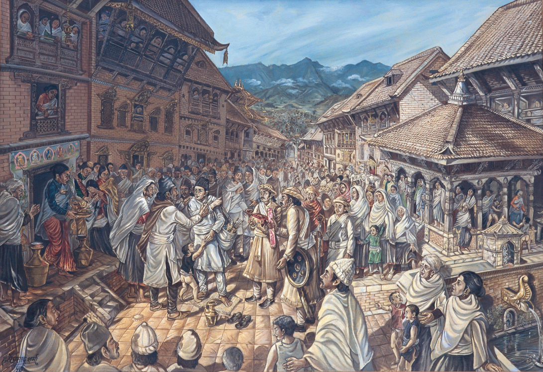 एउटा पेन्टिङमा पृथ्वीनारायण काठमाडौंको कुनै डबलीमा नवदुर्गा नाच हेरिरहेका हुन्छन्। नाच हेर्दाहेर्दै उनी देवीलाई असर्फी चढाउँछन्।