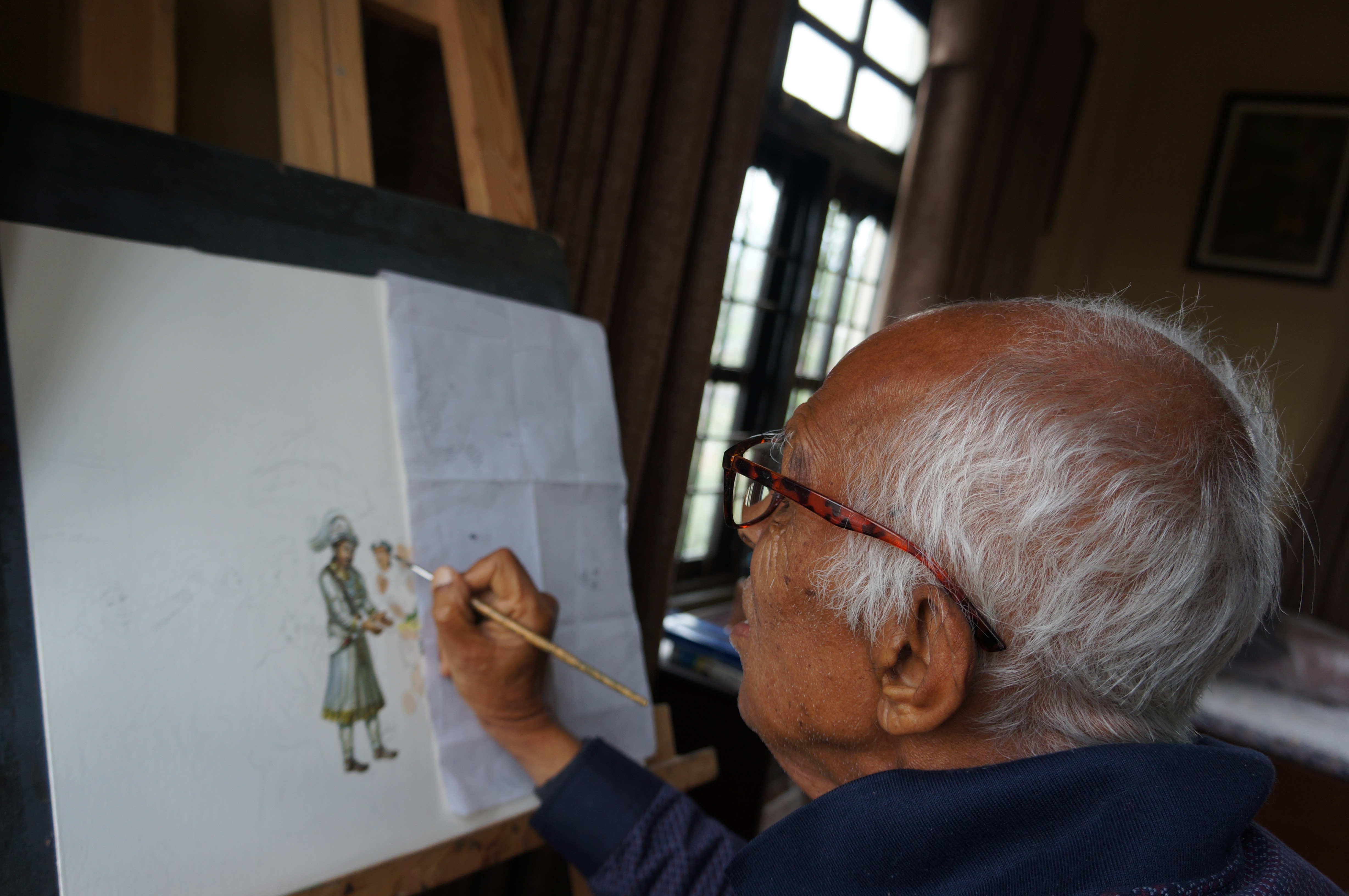 पृथ्वीनारायण शाह शृंखलाको पेन्टिङ निम्ति स्केच तयार पार्दै कलाकार हरिप्रसाद शर्मा।