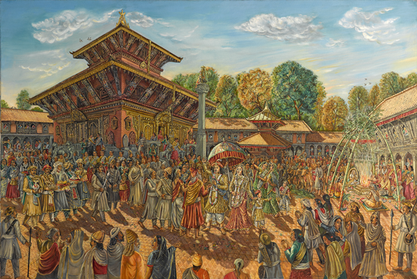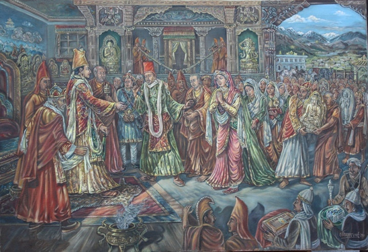 स्तुत चित्रकला विवाहका लागि नेपालबाट डोला झिकाई तिब्बत पुर्याइएका राजकुमारी भृकुटी र तिब्बतका शक्तिशाली सम्राट स्रङ-चङ-गम्पोको प्रथम साक्षात्कार समारोहको हो। तिब्बतको पोताला दरबारमा रहेका स्रङ-चङ-गम्पो, हरिततारा र श्वेतताराका प्रतिमाका आधारमा कलाकारले यो चित्रण गरेका हुन्। राजकुमारी भृकुटीलाई बौद्धग्रन्थहरूमा हरितताराका रूपमा मानिन्छ। चित्र: हरिप्रसाद शर्मा
