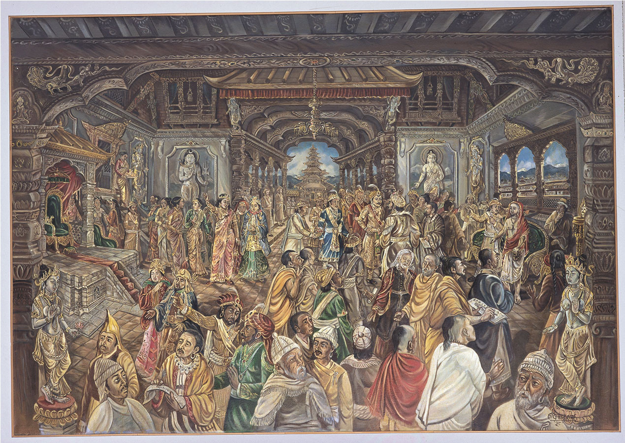 मेरो यो प्रश्नमा विष्णुले भने, ‘बुबाले यसअघि अरनिको चीन गएको र लिच्छवि राजकुमारी भृकुटीको तिब्बती सम्राट स्रङ-चङ-गम्पोसँग विवाह भएको दृश्य क्यानभासमा उतार्नुभएको थियो। ती दुवै पेन्टिङले नेपाल–चीन सम्बन्ध झल्काउँथ्यो। मलाई भारतसँगको ऐतिहासिक सम्बन्ध जोड्ने खालको पेन्टिङ बनाउन पाए हुन्थ्यो भन्ने लाग्यो।’