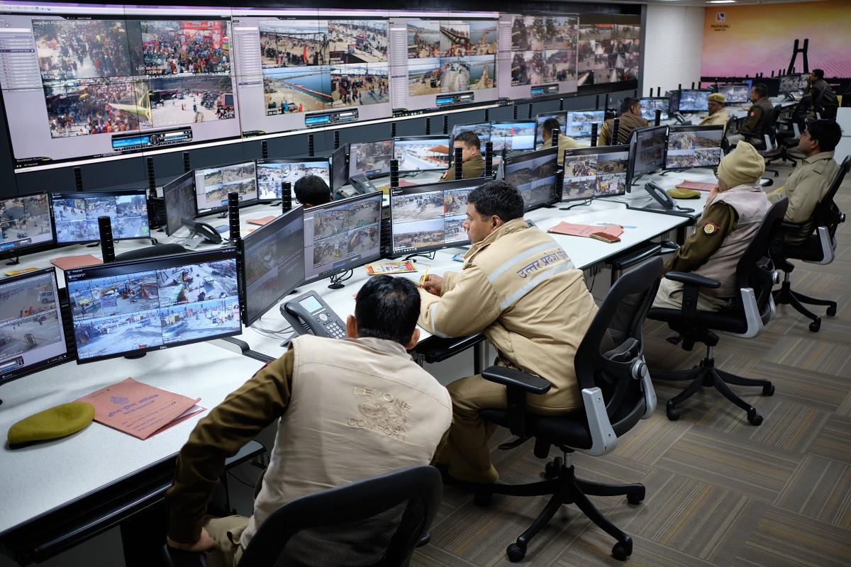 भिडियोले भरिएको एउटै पर्खालमा ५५ इन्चका टिभी स्क्रिन दसवटाका दरले दुई लहरमा राखिएका छन्। प्रहरीका कुर्सी पछिल्तिर झुन्ड्याइएका खाकी ज्याकेटमा ‘उत्तर प्रदेश पुलिस’ अंकित छ। यी प्रहरी अधिकारीहरू भुइँमा ओछ्याइएको गलैंचामाथि खाली खुट्टाले लगातार थप्थप्याइरहेका छन्। उनीहरू ‘सबथोक ठिक त छ?’ भन्ने भावले एकअर्कालाई नियाल्ने र लगत्तै सकारात्मक प्रतिक्रियाबाट सन्तुष्ट हुने गरिरहेका देखिन्छन्।