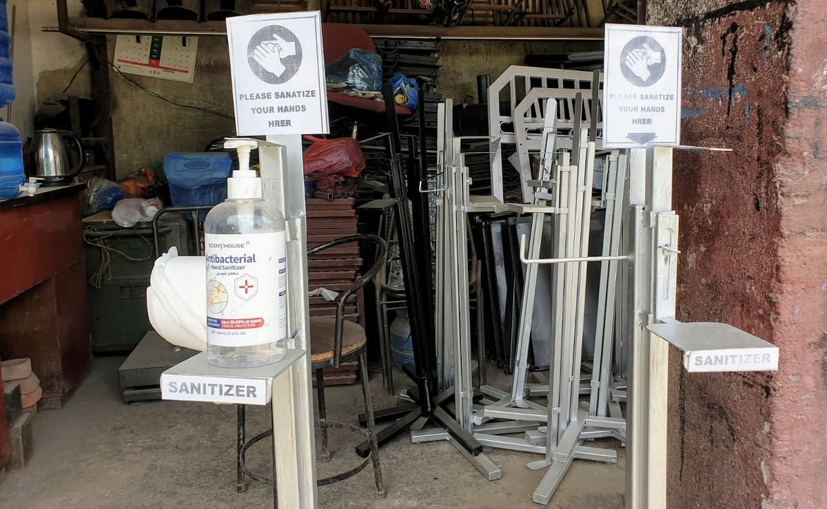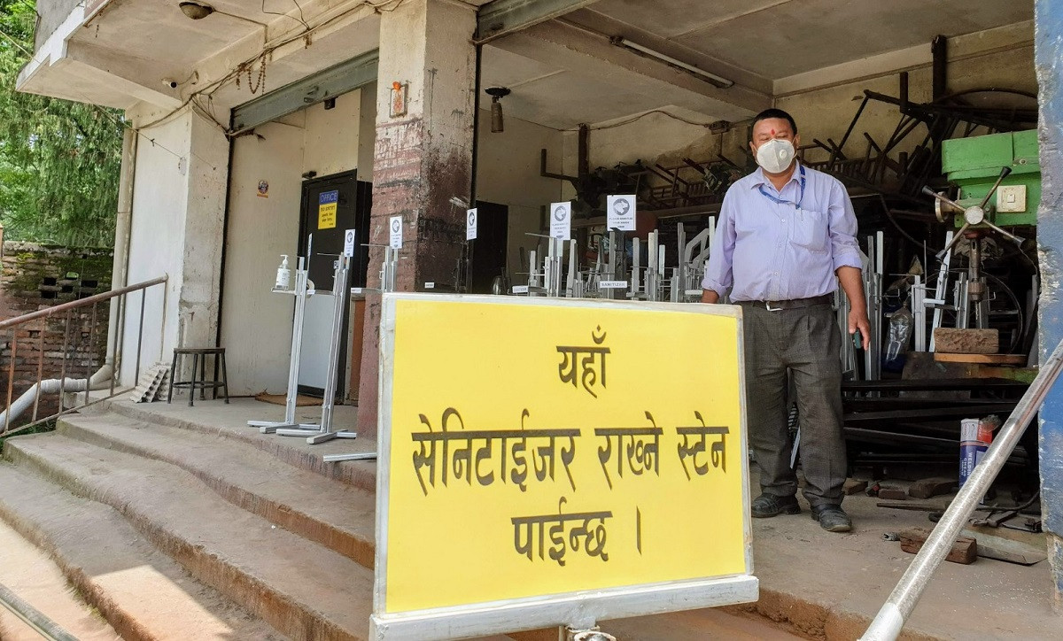 'भारतबाट मगाएर बेच्नुभन्दा आफैं बनाउनु सजिलो र फाइदा देखेँ,' उनले भने। अहिले उनी स्यानिटाइजर स्ट्यान्ड बनाएर बेचिरहेका छन्।
