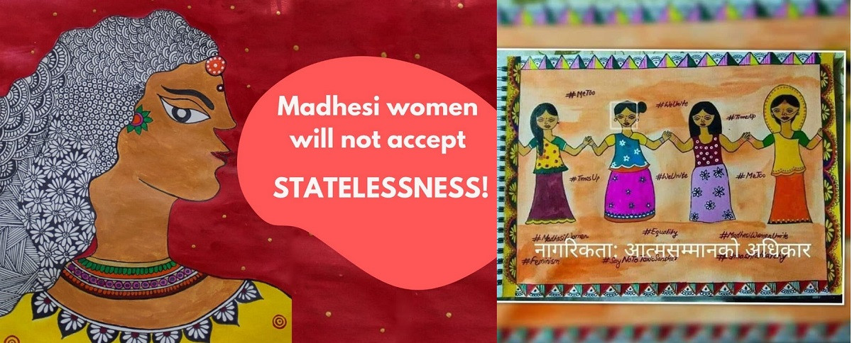 'मधेसी महिलालाई राज्यविहीनता स्वीकार छैन' एक मधेसी महिलाको चित्रमार्फत् उनीहरूले समान नागरिकता माग गरेका छन्। मधेसी समुदायमा नागरिकता बहस अन्य क्षेत्रभन्दा बढी संवेदनशील बन्ने यी दुईको भनाइ छ।