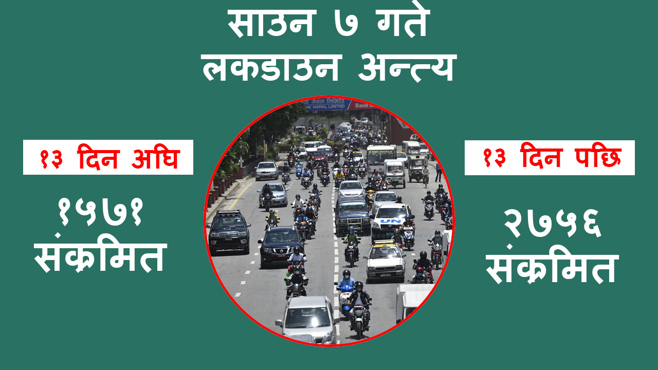 तर लकडाउन अन्त्य हुनुपूर्व सोही अवधिको तथ्यांक अनुसार जम्मा १ हजार ५ सय ७१ जना संक्रमित थपिएका थिए। अर्थात् लकडाउन खुलेपछि झन्डै दोब्बर संख्याले कोरोना संक्रमित भेटिएका छन्।